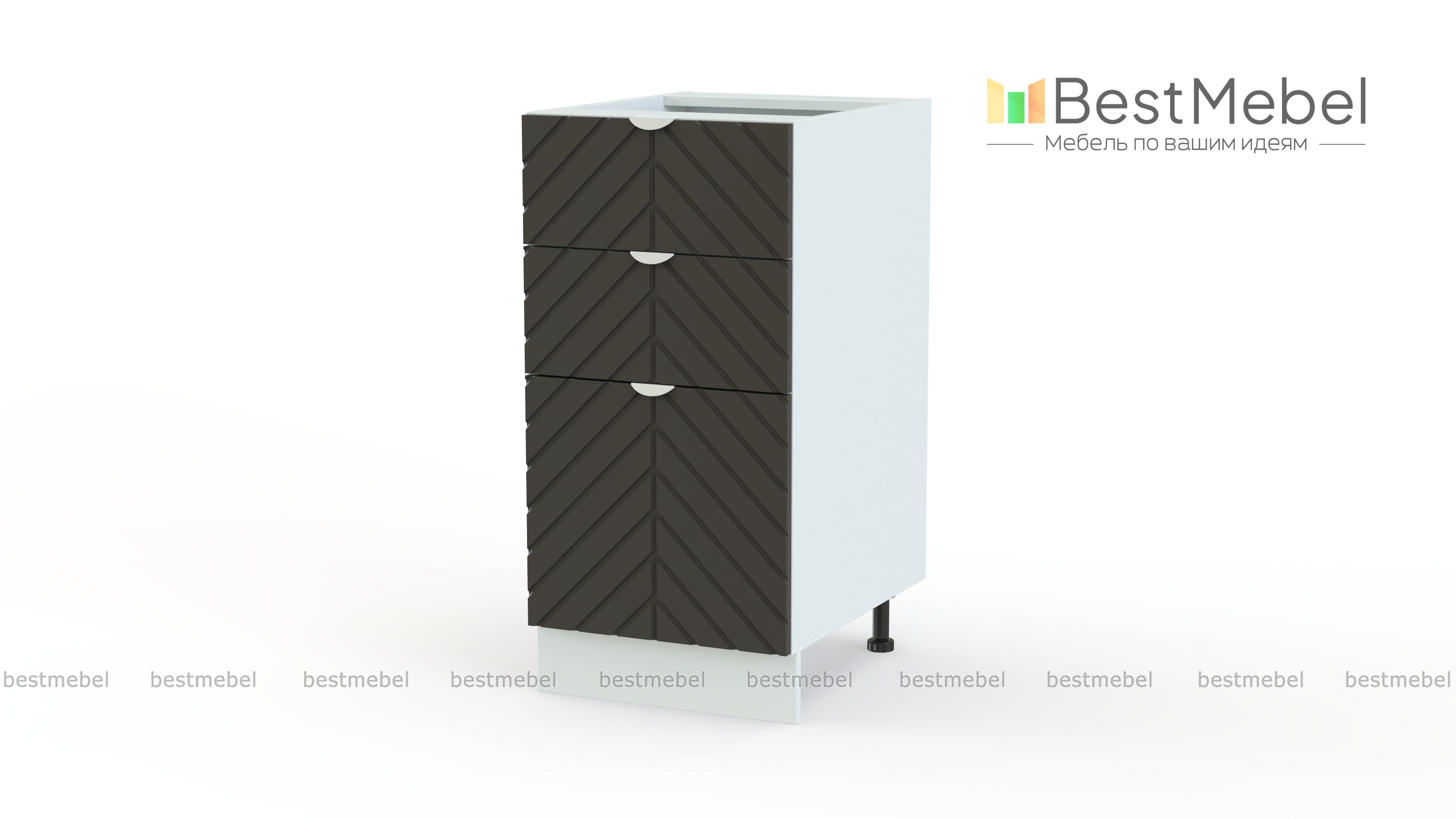 Шкаф нижний с 3-мя ящиками Анаис BMS не даст потеряться кухонным мелочам и поможет разместить более габаритные вещи. Два малых выдвижных ящика сверху дополнены одним большим, расположенным в нижней части шкафа. Фрезеровка «ёлочкой» на светлом фасаде из МДФ и полукруглые ручки в тон придают этой модели особенно стильный вид. Купить шкаф нижний с 3-мя ящиками Анаис BMS с выбором нужных размеров, цвета и фурнитуры вы сможете на сайте нашего интернет-магазина.