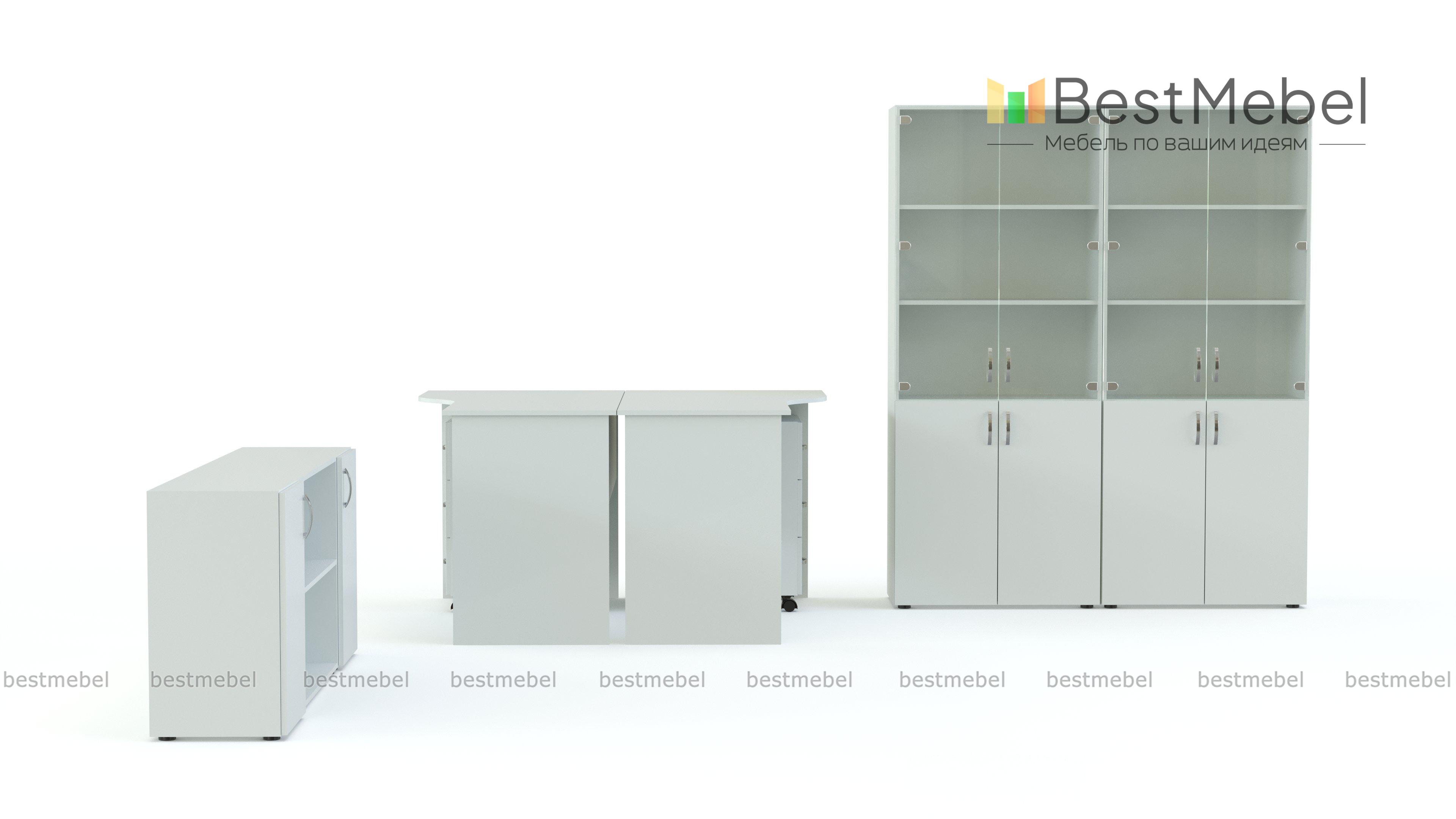 Два вместительных шкафа имеют стеклянные дверцы. Здесь удобно хранить документы, которые должны всегда быть на виду. Мебель изготовлена из ламинированного ДСП и защищена ПВХ кромкой, которая убережет изделия от механических повреждений. Купить комплект для офиса можно на нашем сайте по доступной цене.