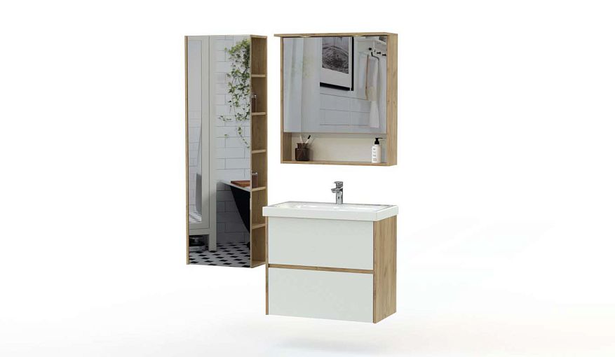 Комплект для ванной Лестер 1 BMS поможет создать актуальный интерьер с элементами стиля лофт или модерн. Композиция включает в себя тумбу под раковину, навесной зеркальный шкаф с нишей для хранения мелочей и пенал, дополненный открытыми торцевыми полками. В оформлении модулей скомбинированы древесные тона, зеркала и нейтральные белые фасады. Купить комплект для ванной Лестер 1 BMS и создать комфортное, эргономичное пространство вы сможете с помощью нашего интернет-магазина.