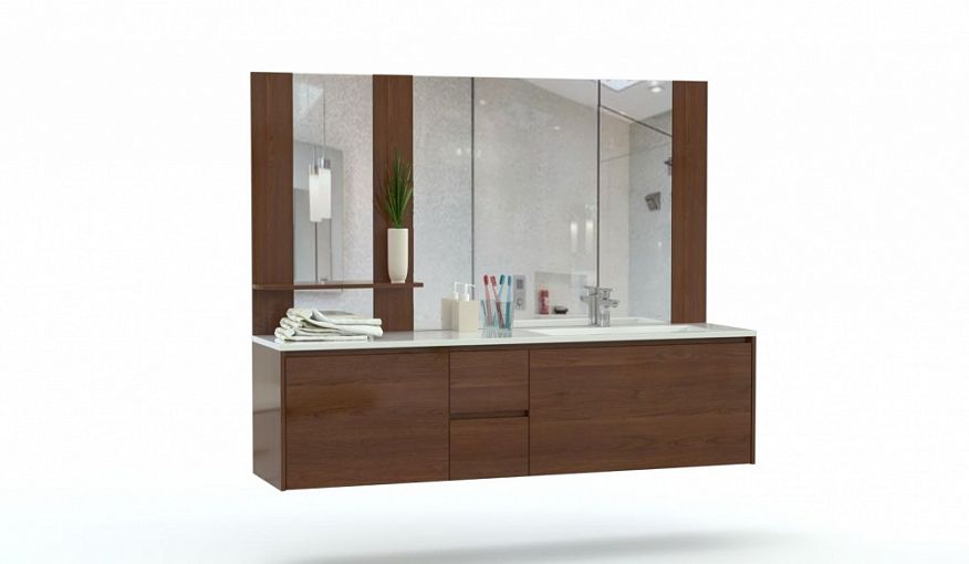 Мебель для ванной Майло 5 BMS поможет создать эффектный интерьер, в котором минималистичные формы сочетаются с теплыми оттенками имитации древесной текстуры. Композиция для большой ванной комнаты включает в себя тумбу под раковину с широкой столешницей и выдвижными ящиками для хранения уходовых средств и зеркало, дополненное боковыми панелями с открытыми полками. Подвесная конструкция модулей сохранит полезную площадь и облегчит уборку. Купить мебель для ванной Майло 5 BMS с возможностью изготовления по индивидуальным размерам приглашаем в наш интернет-магазин.