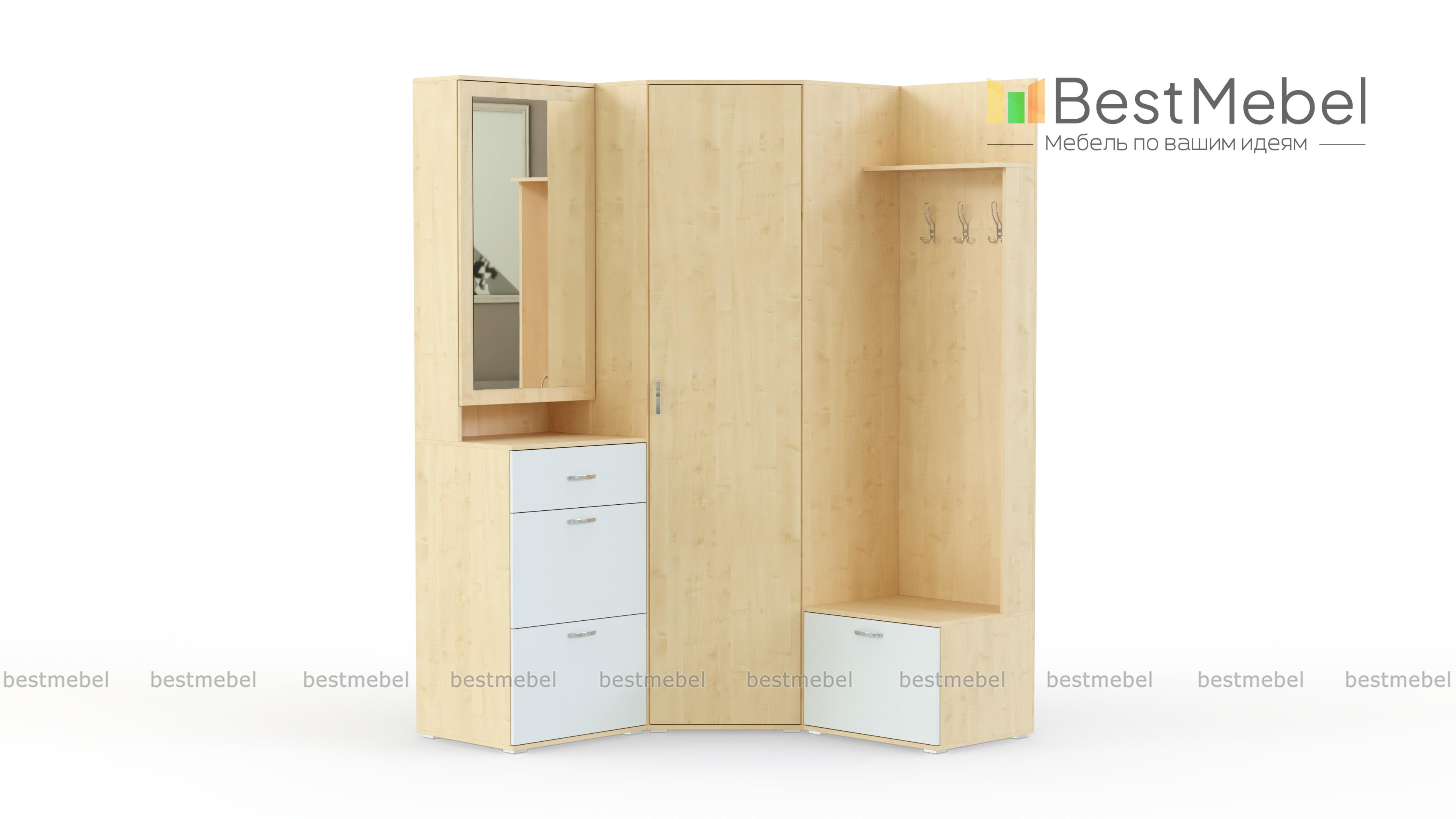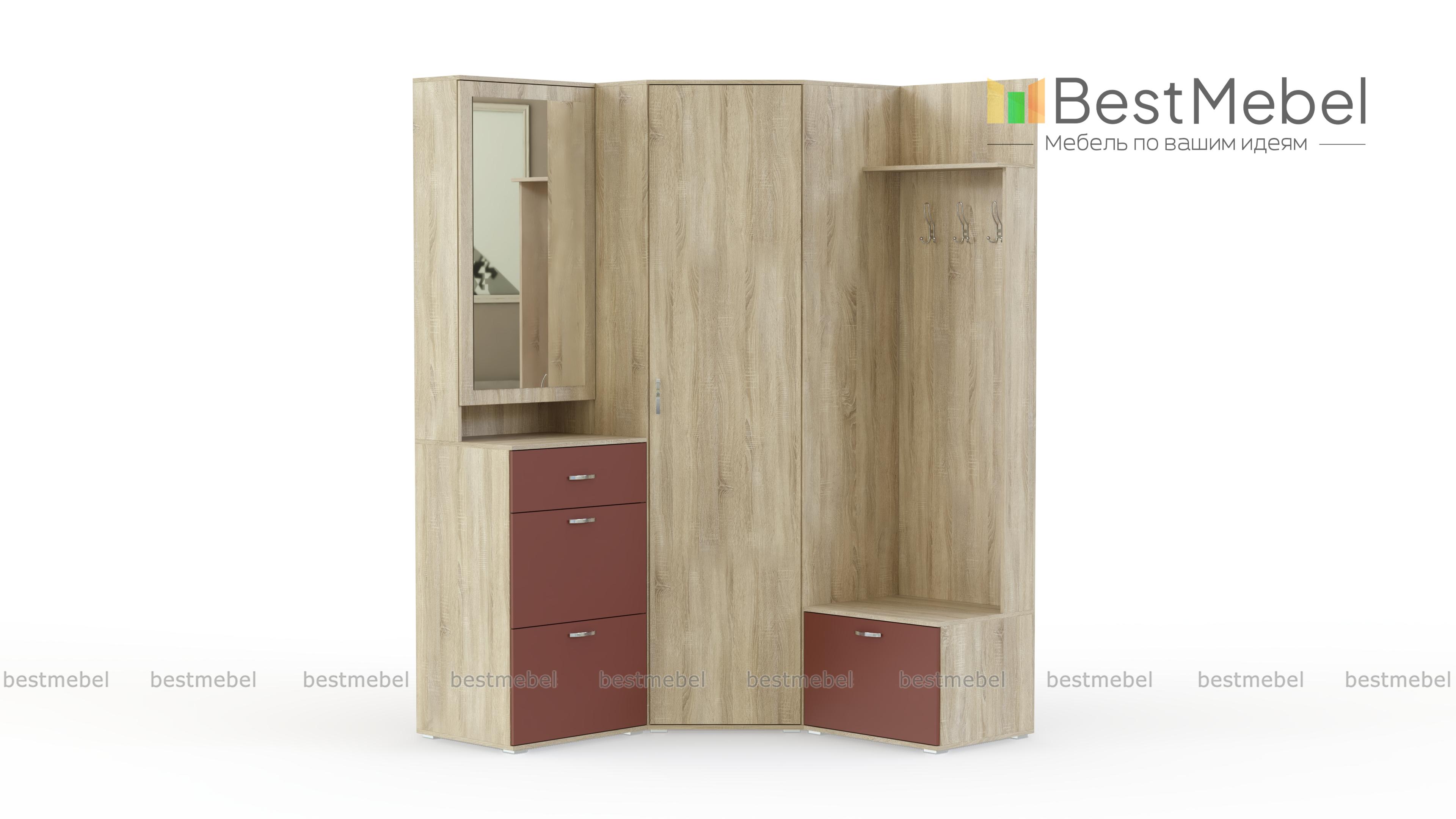 Прихожая Бриз 1 BMS позволит обустроить комфортную входную зону, выгодно используя особенности планировки. Угловой комплект станет практичным решением для малогабаритных помещений, а нейтральное цветовое решение в древесных тонах гармонично впишется в большинство современных интерьеров. Прихожая включает в себя три функциональных модуля – угловой платяной шкаф, открытую вешалку с полкой и тумбой и секцию с зеркальным шкафчиком и обувницей. Купить прихожую Бриз 1 BMS приглашаем в наш интернет-магазин по доступной цене.