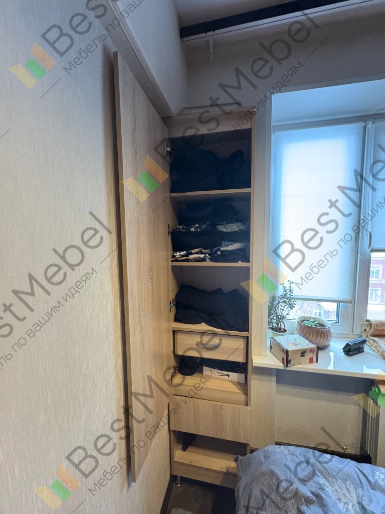 Хотел шкаф, но места мало. Нашёл на Ozon. Слегка выпивший, снял размеры. Шкаф пришёл — на место встаёт. А то, что не всё открывается, — это проблемы шкафа. Пришлось самому чуть‑чуть доработать, но это мой косяк. Шкафом доволен. Руководство по сборке почему‑то не открывается на компьютере; с телефона читать не очень удобно, но это не критично.