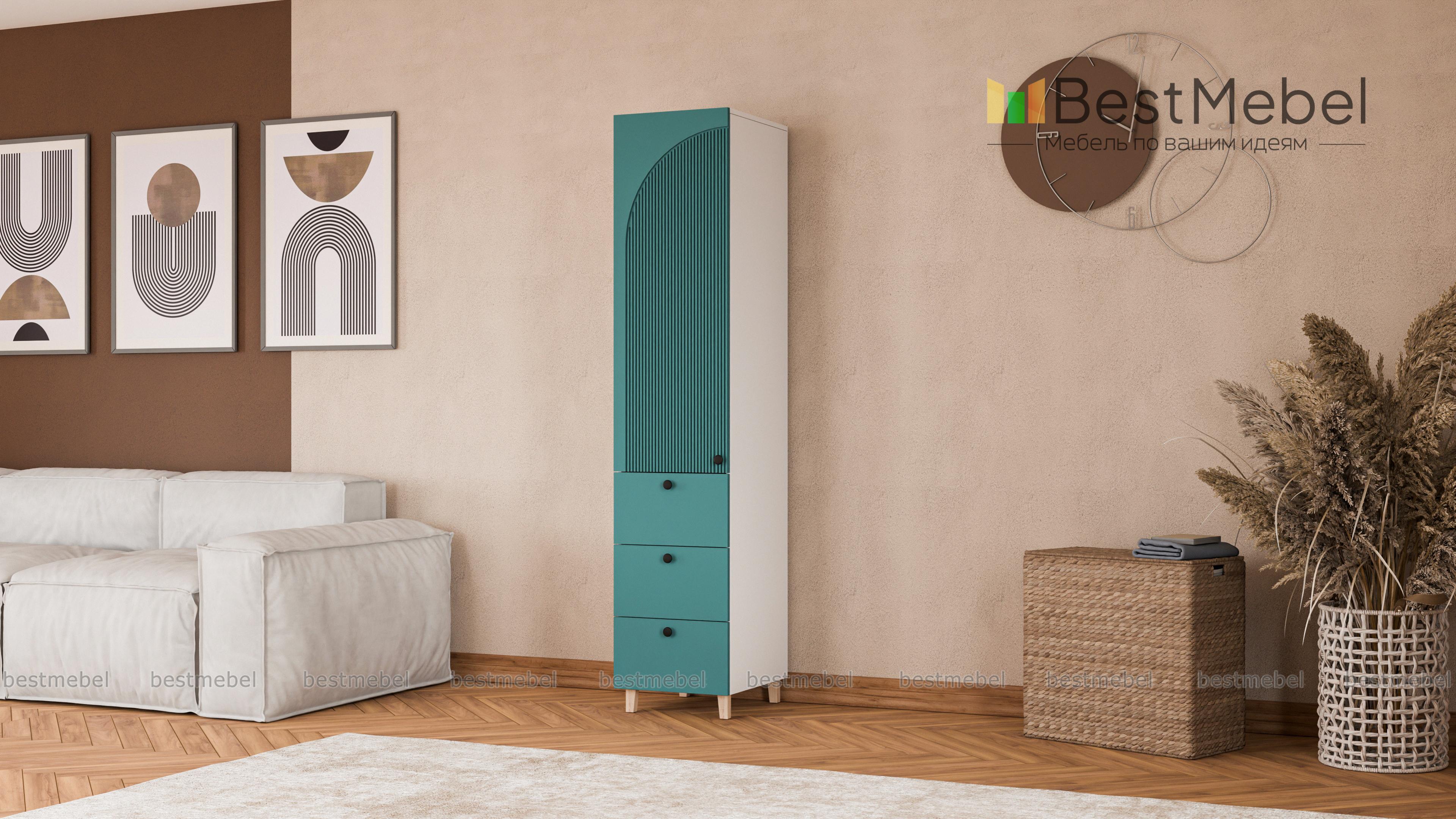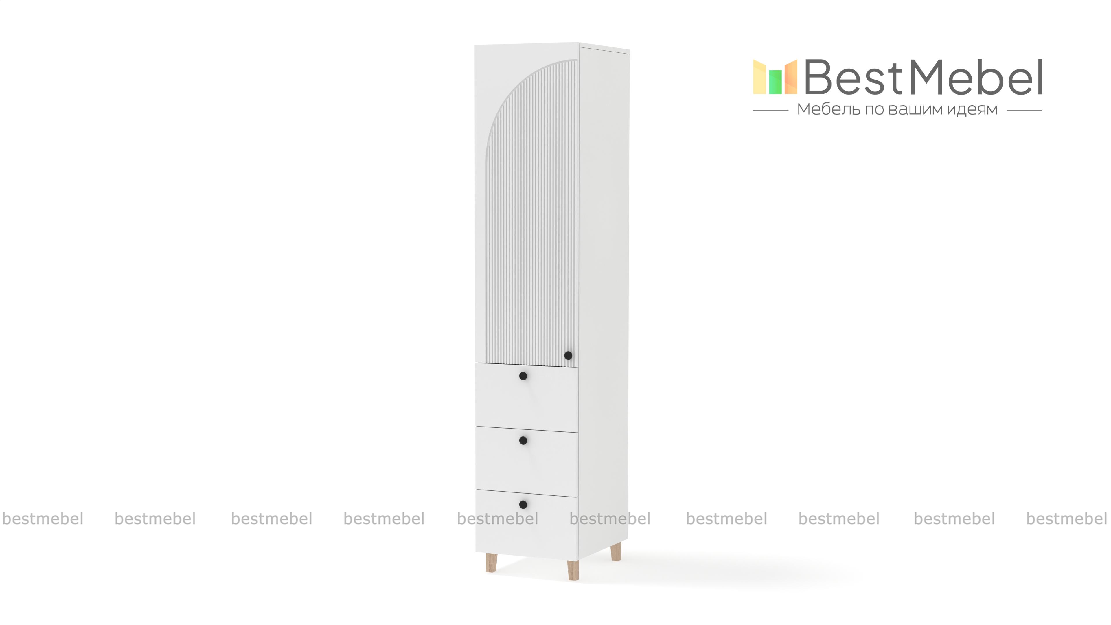 Шкаф-пенал Вивьен 1 BMS с опорами в стиле сканди универсален и отлично справляется с хранением одежды и текстиля для дома, учебных пособий, игрушек и кухонной утвари. Под распашной секцией с полками расположились три вместительных ящика с легким выдвижением. Покрытие корпуса и фасада отличается износостойкостью, а для декора использована стильная асимметричная фрезеровка. Купить шкаф-пенал Вивьен 1 BMS с выбором размеров, цвета и фурнитуры вы сможете недорого в нашем интернет-магазине.