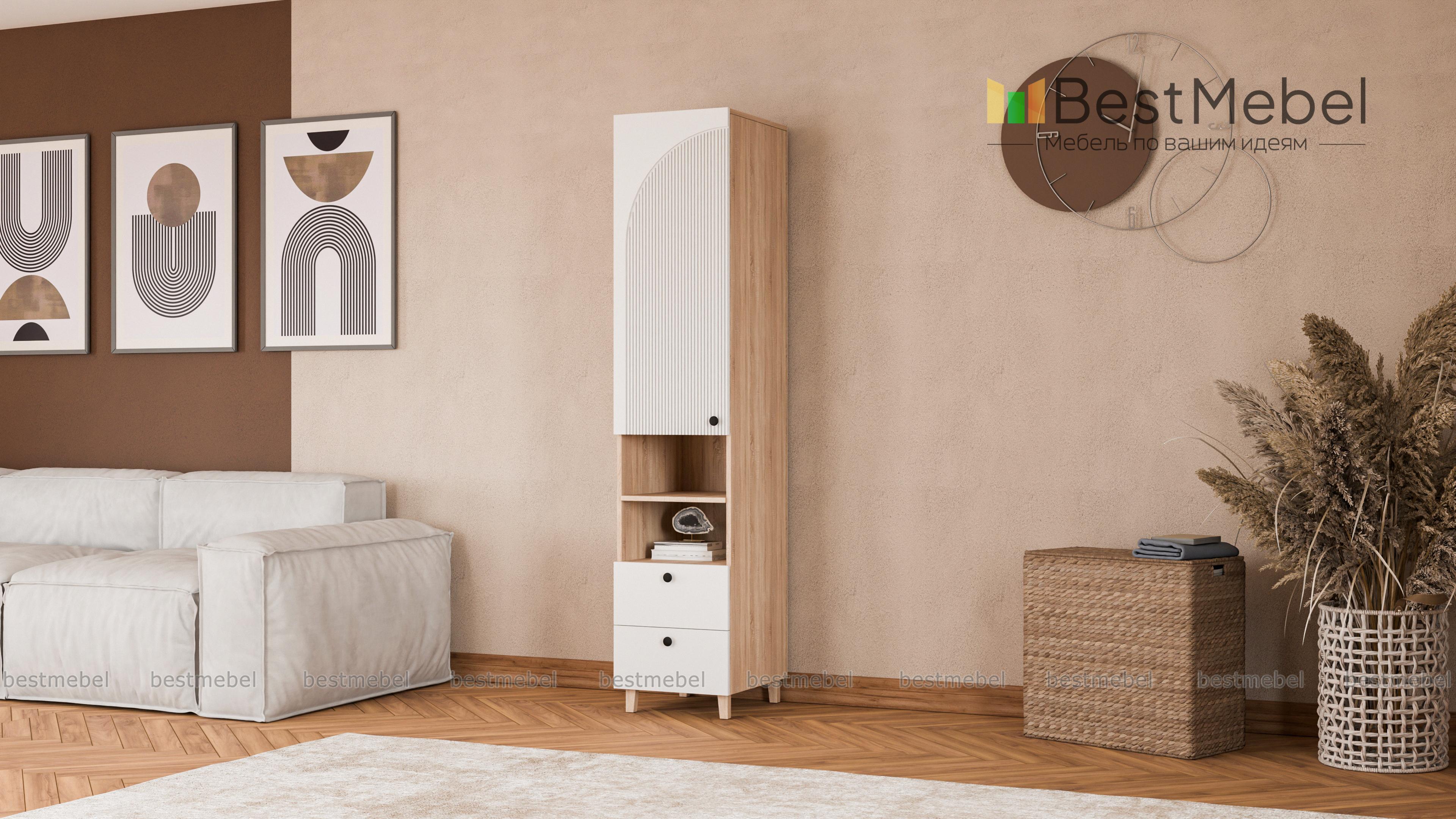 Шкаф-пенал Вивьен 5 BMS — небольшой и функциональный, отлично смотрится и в детской, и в гостиной. Древесного оттенка корпус с высокими ножками, изготовленный из ЛДСП, дополняет стильный фактурный фасад. Для удобного хранения конструкцией предусмотрены вместительное распашное отделение, ниша с полкой и два выдвижных ящика, расположенных снизу. Купить шкаф-пенал Вивьен 5 BMS с выбором размеров, цвета и фурнитуры вы сможете на сайте нашего интернет-магазина.