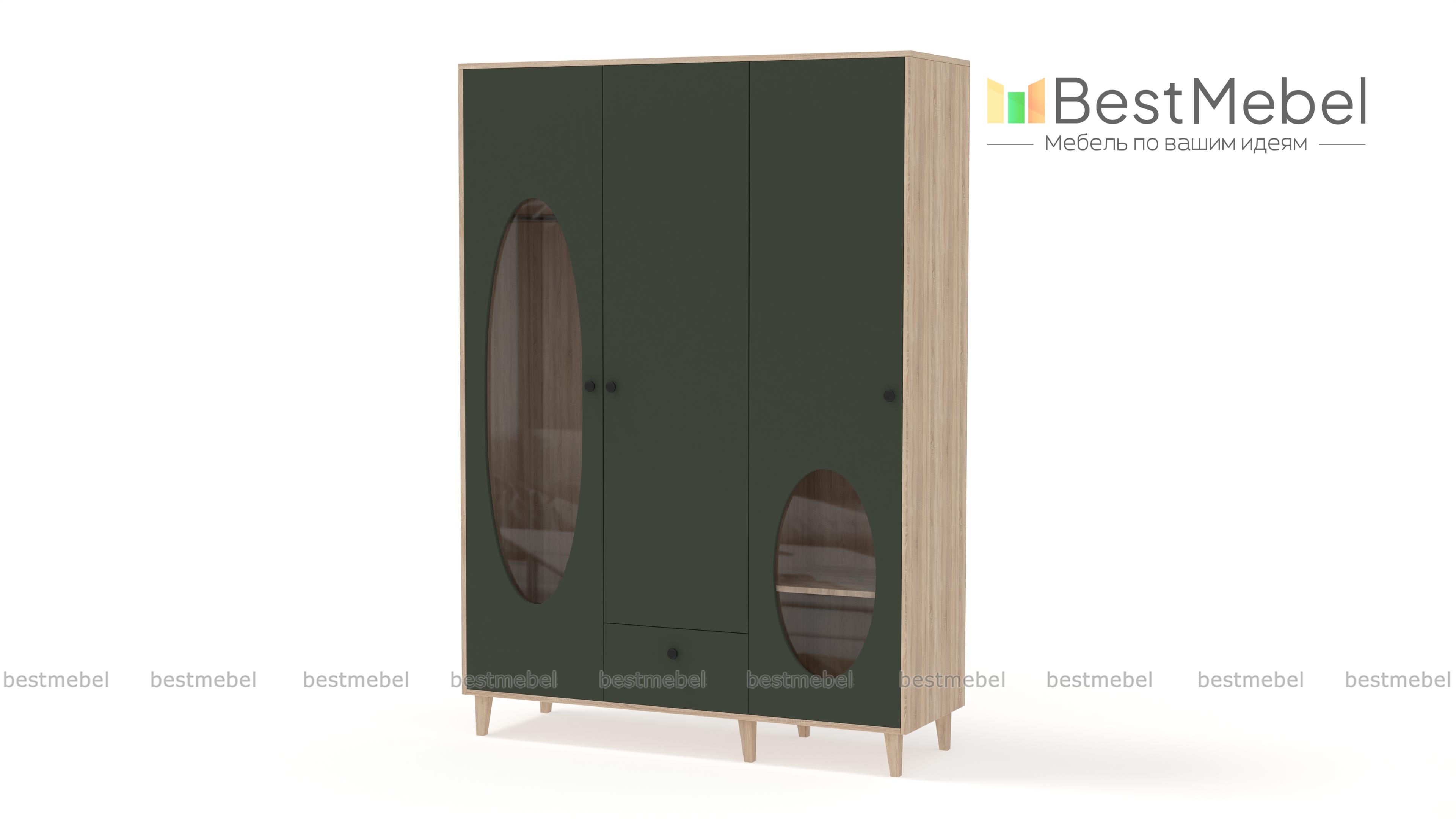 Шкаф распашной Брукс 2 BMS с высокими деревянными ножками не только сохранит вещи в порядке, но и придаст индивидуальность интерьеру. Трехдверный гардероб для спальни или детской оборудован двумя отделениями для хранения одежды, а внизу предусмотрен выдвижной ящик под мелкий трикотаж. Необычное дизайнерское решение — большие овальные вырезы со стеклом на дверцах. Купить шкаф распашной Брукс 2 BMS, изготовленный по индивидуальным размерам, вы сможете на сайте нашего интернет-магазина.