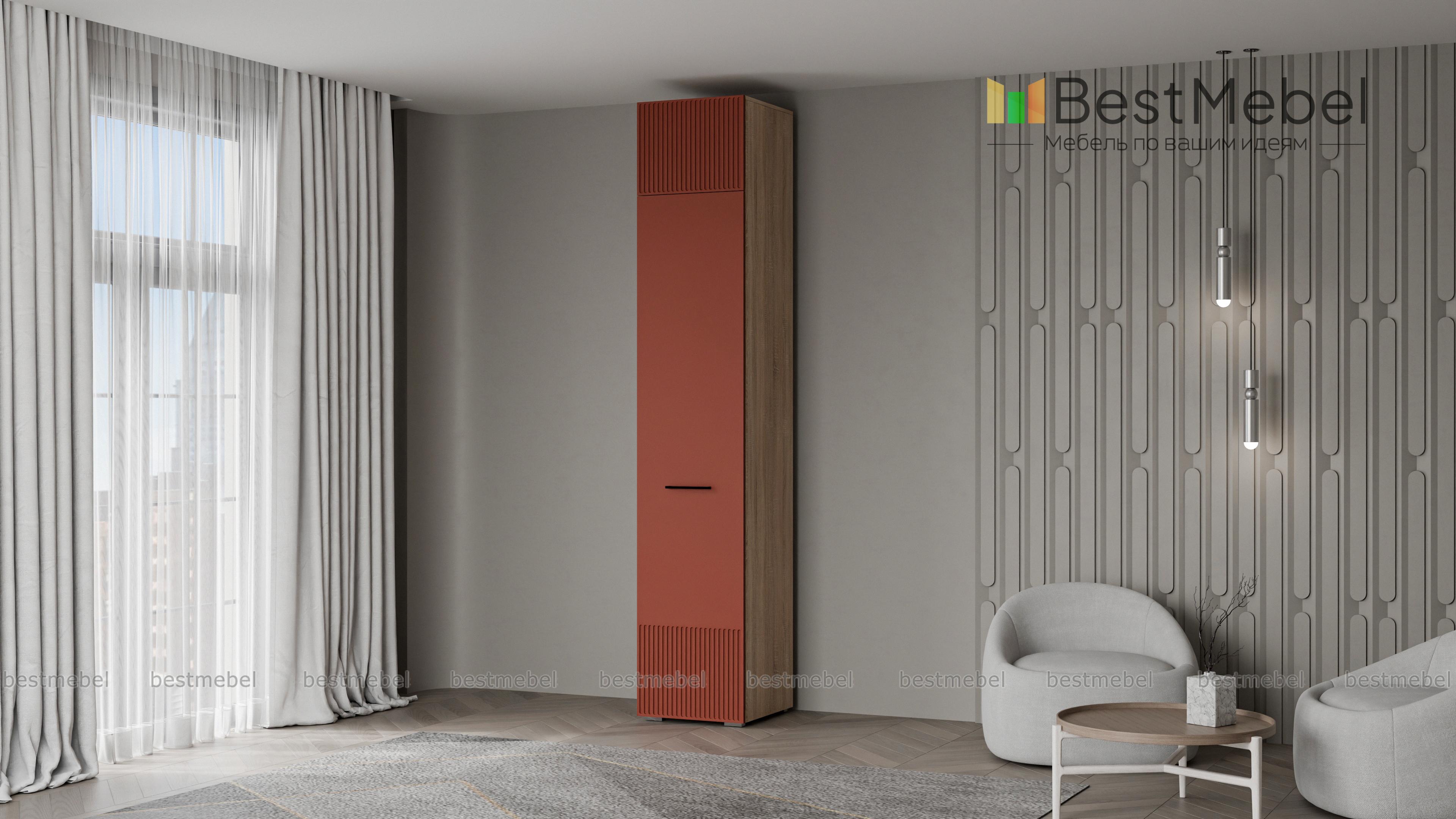 Шкаф распашной Декарт 7 BMS с одной дверцей и антресолью подходит для самых разных помещений. Высокий узкий шкаф с простым и выразительным благодаря фрезеровке дизайном оснащен необходимой для размещения вешалок с одеждой перекладиной и полочкой. Дополнительный отсек сверху значительно увеличивает пространство для хранения. Купить шкаф распашной Декарт 7 BMS вы сможете недорого в нашем интернет-магазине, подобрав подходящие именно вам цвета и размеры.