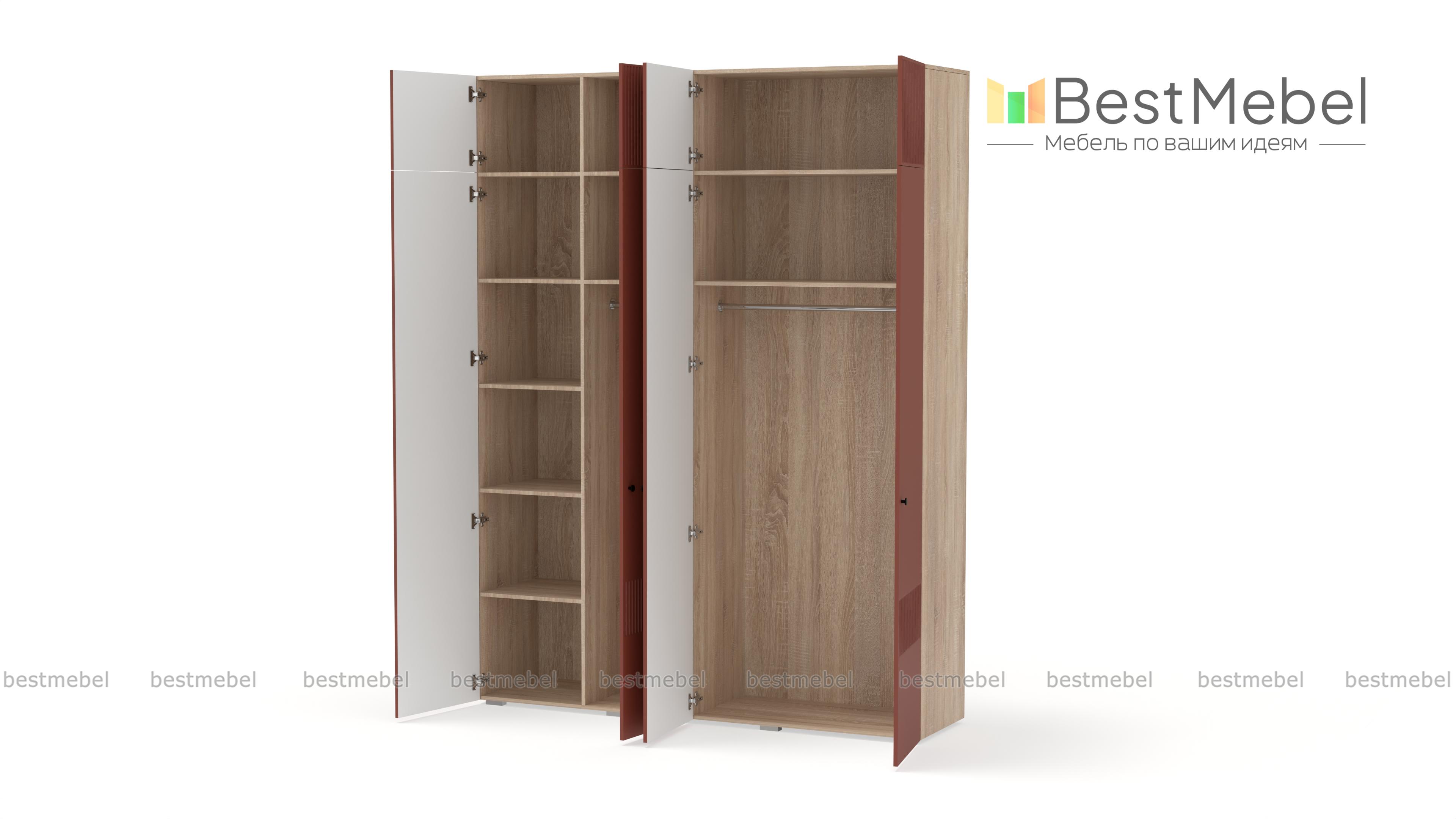 Шкаф распашной Джосс 10 BMS с четырьмя дверцами и антресолью можно разместить в разных комнатах: небольших спальнях, прихожих и детских. Оригинальные оттенки корпуса и фасада создают комфортную атмосферу в помещении, стильный акцент в отделке — фрезерованный орнамент. За дверцами справа скрыты штанга и полка, а слева — узкая платяная секция и бельевой стеллаж. Купить шкаф распашной Джосс 10 BMS с выбором размеров, цвета и фурнитуры вы сможете недорого в нашем интернет-магазине.