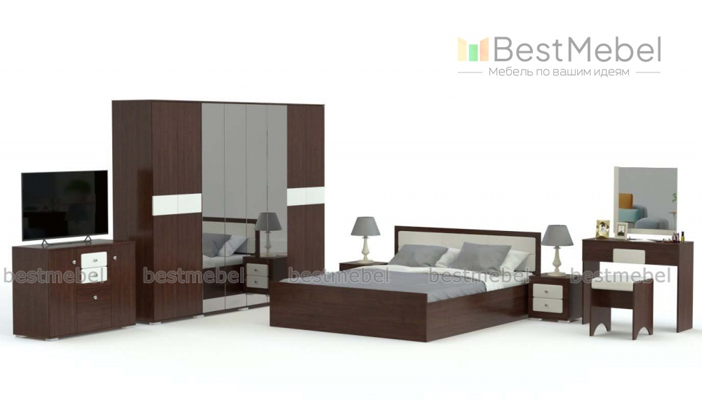 Стильный современный комплект Амели комплектация 2 BMS не только украсит вашу комнату, но и позволит разместить множество вещей. Особую вместительность этой модели обеспечивают два одежных шкафа с зеркальными дверцами и просторный комод. Двуспальная кровать дополнена тумбами с выдвижными ящиками, а хозяйка дома непременно оценит оригинальный туалетный столик с навесным зеркалом и удобной банкеткой. Цветовое решение для этого гарнитура вы сможете подобрать самостоятельно.
