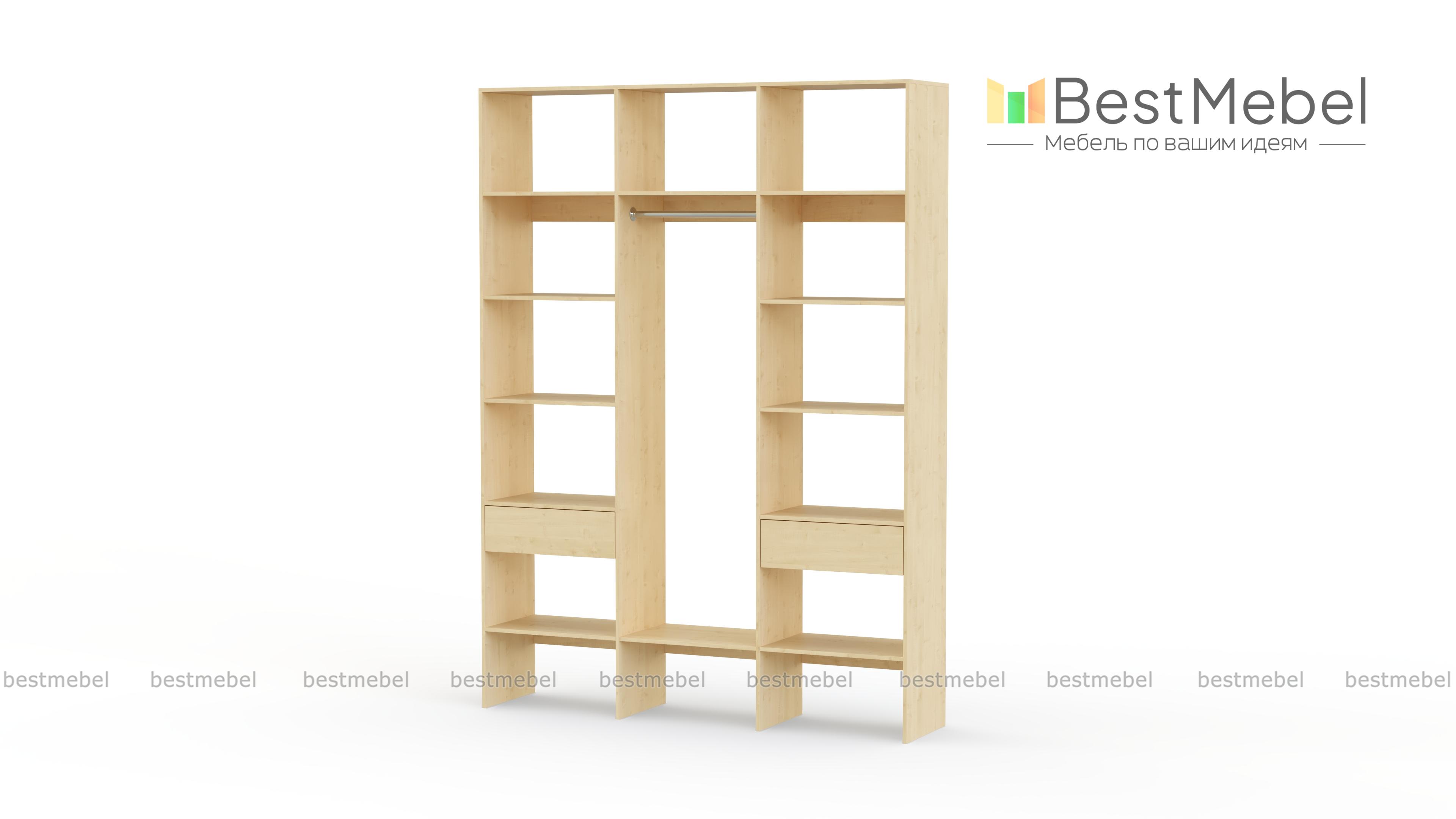 Стеллаж для одежды Мирта 14 BMS разработан специально для хранения в открытом доступе одежды, обуви и прочих предметов гардероба. В центре располагается отделение со штангой, а по периметру – открытые секции и два выдвижных ящика для мелких вещей. Визуально легкий и прочный, стеллаж выполнен из ЛДСП – износостойкого материала с широким выбором цветовых решений. Купить стеллаж для одежды Мирта 14 BMS, изготовленный по вашим размерам, вы всегда сможете на сайте нашего интернет-магазина.