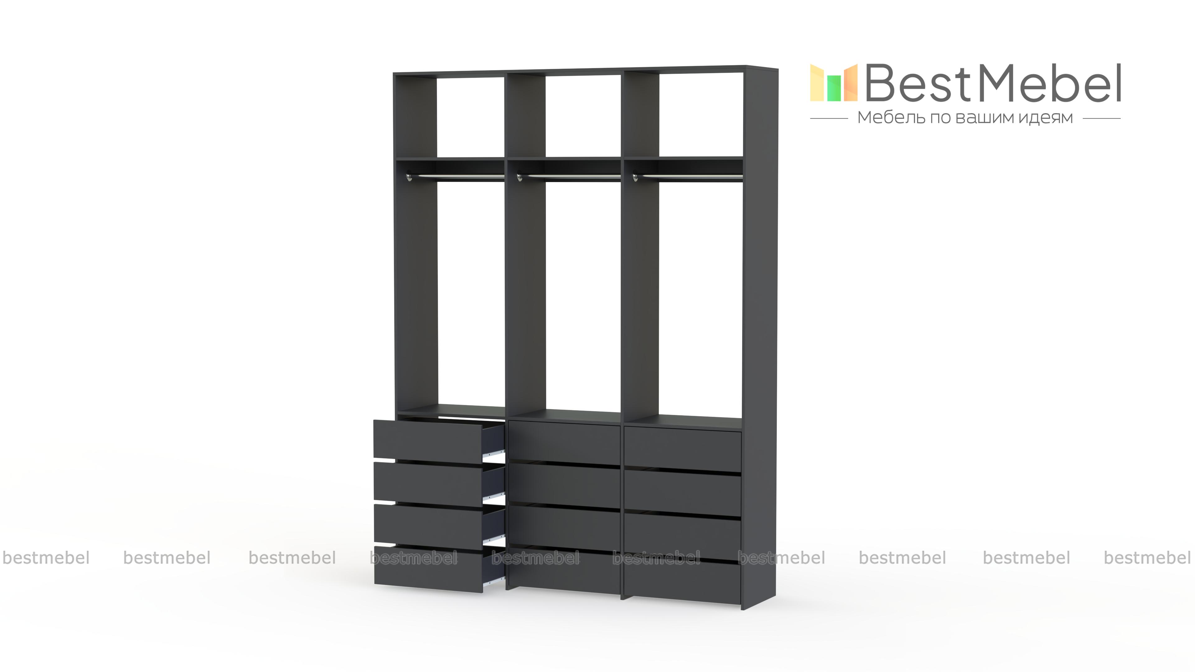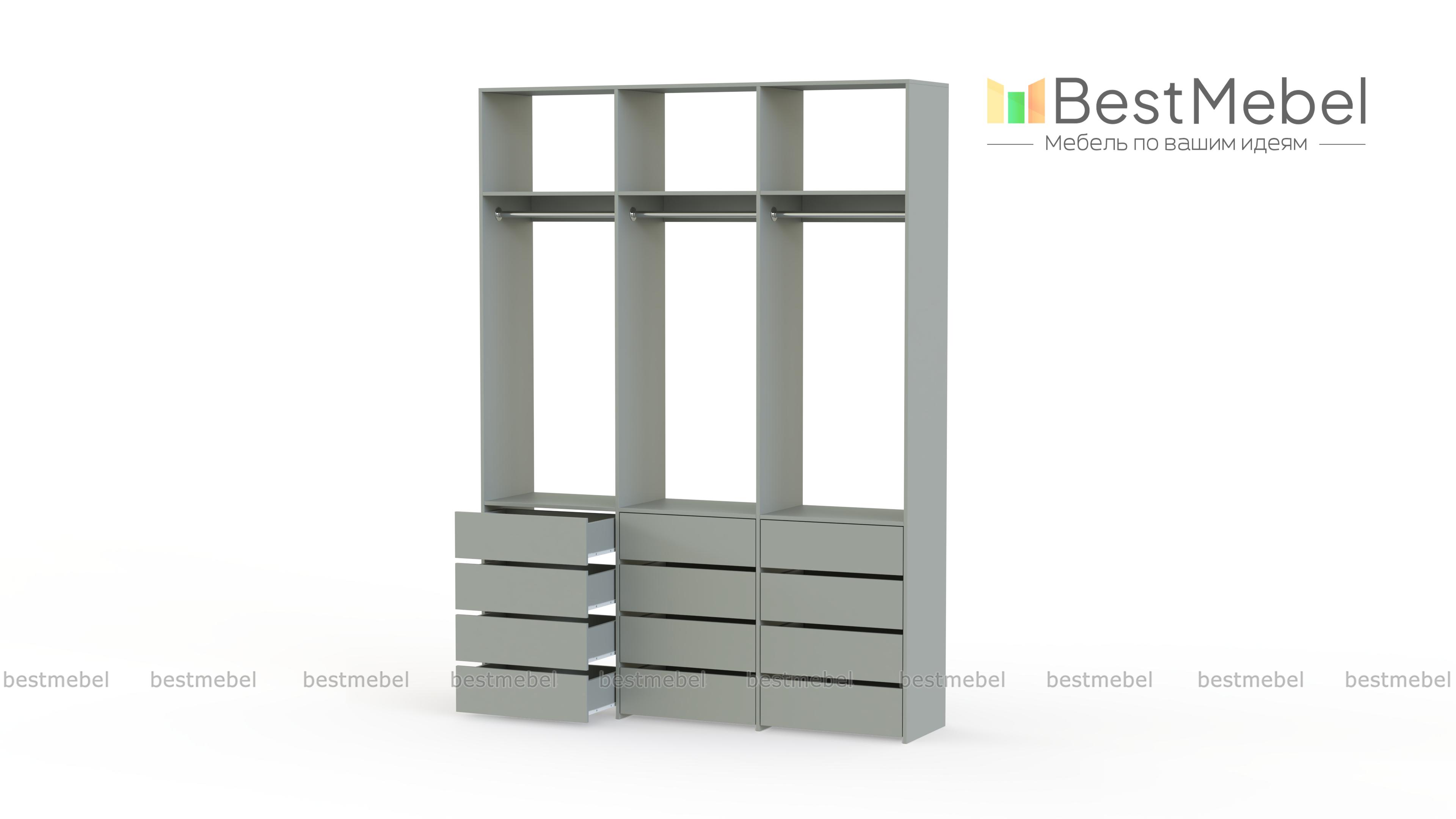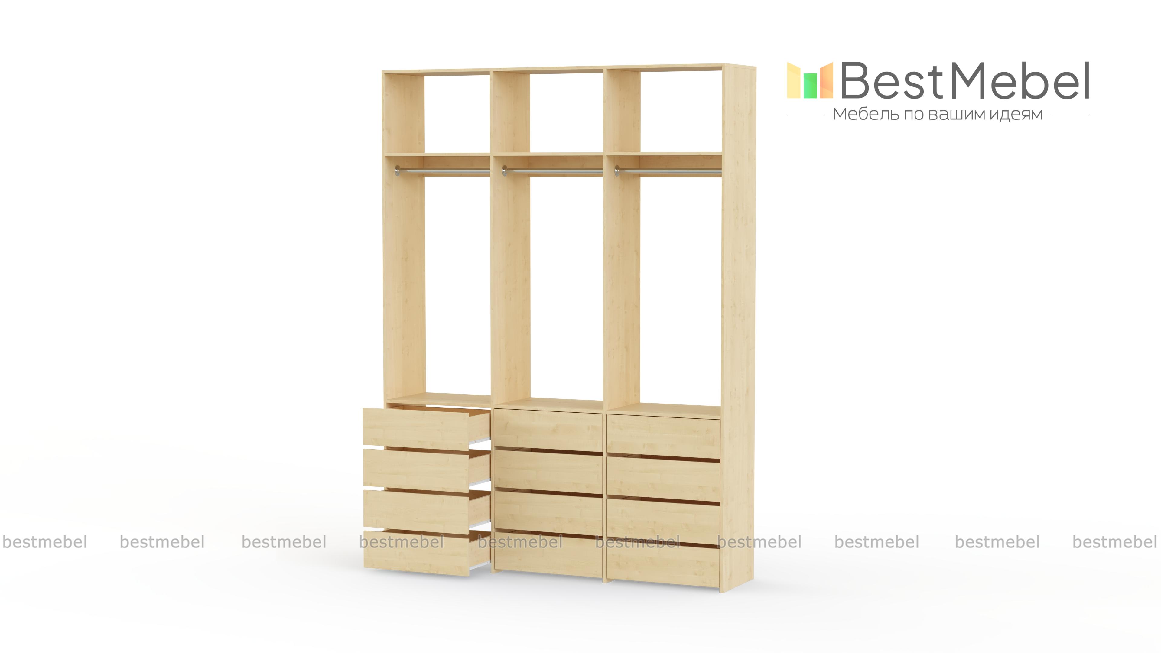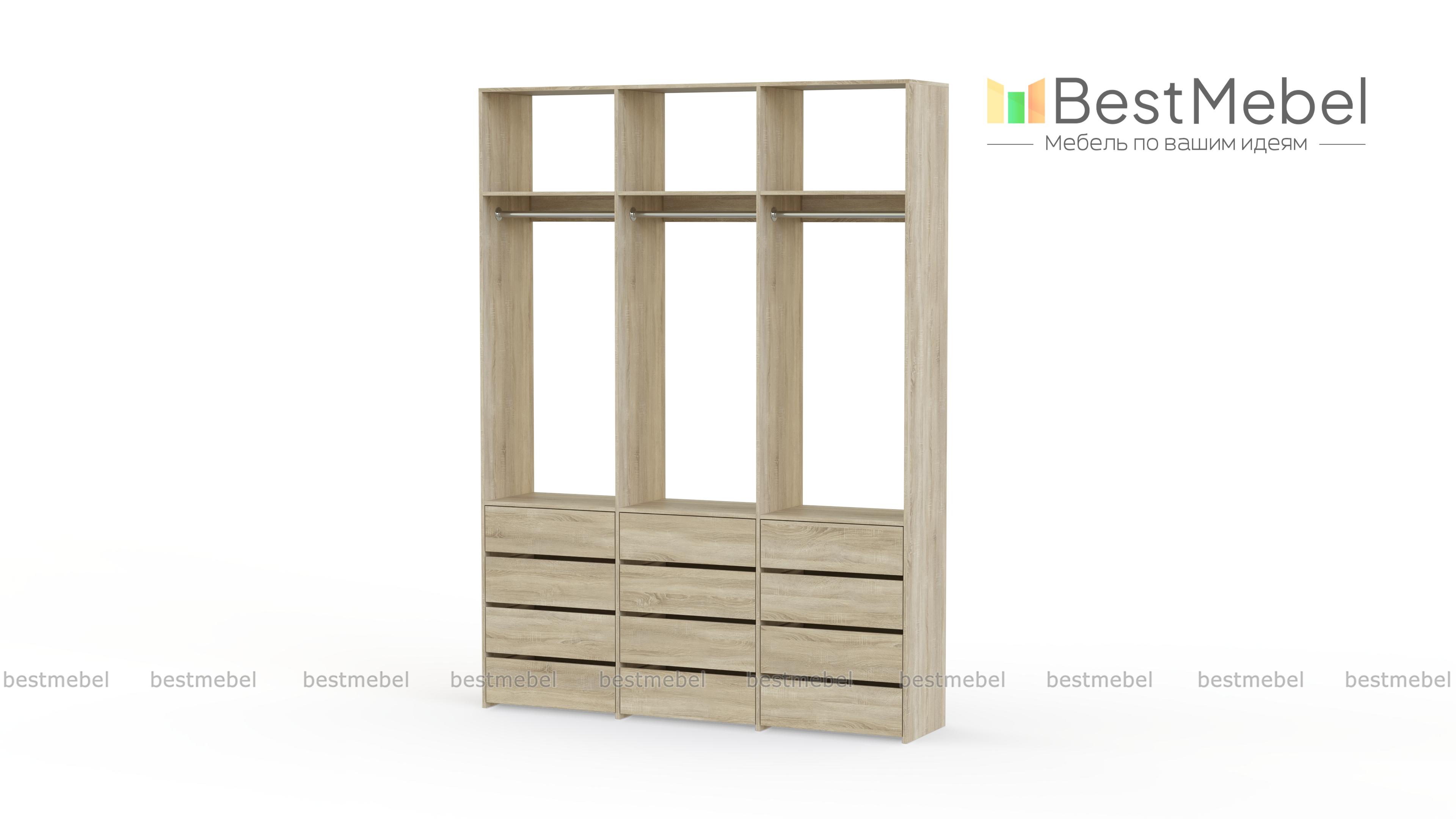 Стеллаж для одежды Мирта 47 BMS выполнен из прочной ламинированной ДСП и включает в себя три секции. В нижней части располагаются выдвижные ящики для текстиля и аксессуаров, средняя занята платяными штангами, а верхняя — полками для несезонных вещей. Минималистичный дизайн позволяет стеллажу легко вписаться в существующий интерьер. Купить стеллаж для одежды Мирта 47 BMS, изготовленный по индивидуальным размерам, вы сможете в нашем интернет-магазине.