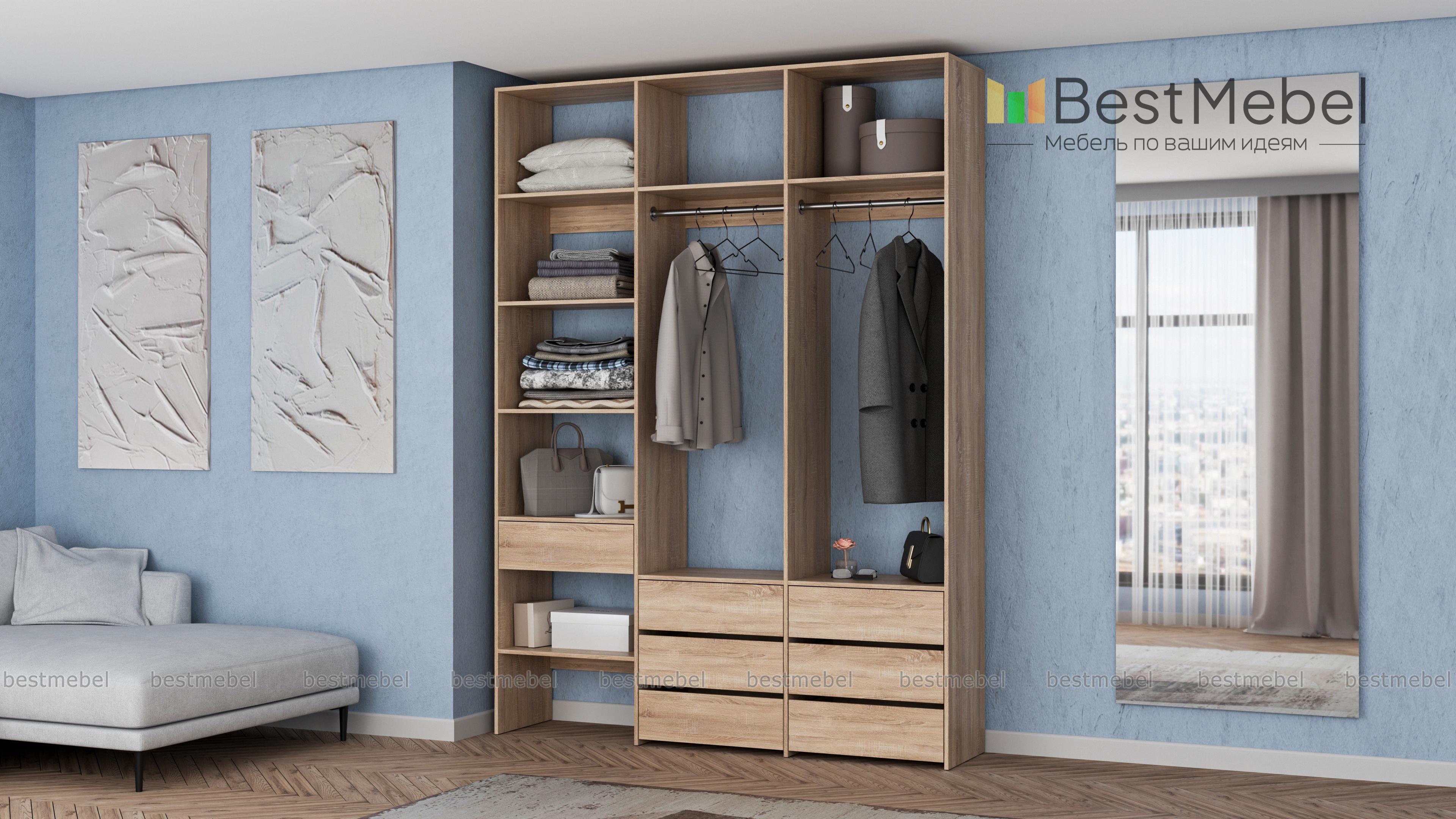 Стеллаж для одежды Мирта 52 BMS оборудован не только двумя штангами, но и расположенными на разных уровнях выдвижными ящиками и полками. Конструкция позволяет вам бережно разместить вещи на вешалках и трикотаж, коробки с обувью и корзины со всевозможными мелочами. Стеллаж выполнен из прочной ЛДСП, что обеспечивает ему долгий срок службы и эстетичный внешний вид. Купить стеллаж для одежды Мирта 52 BMS вы сможете в нашем интернет-магазине, подобрав размеры и цвет по каталогу.