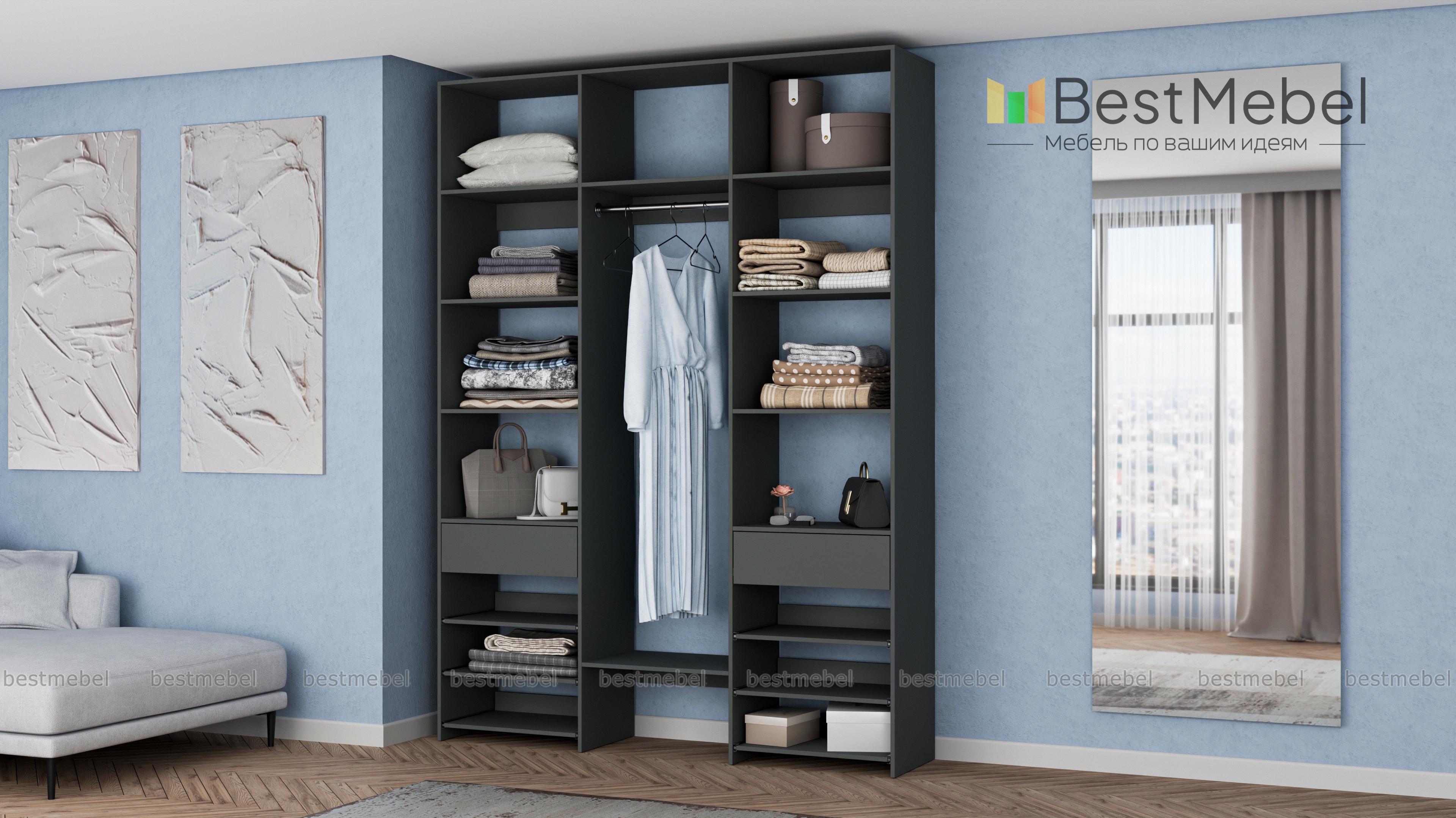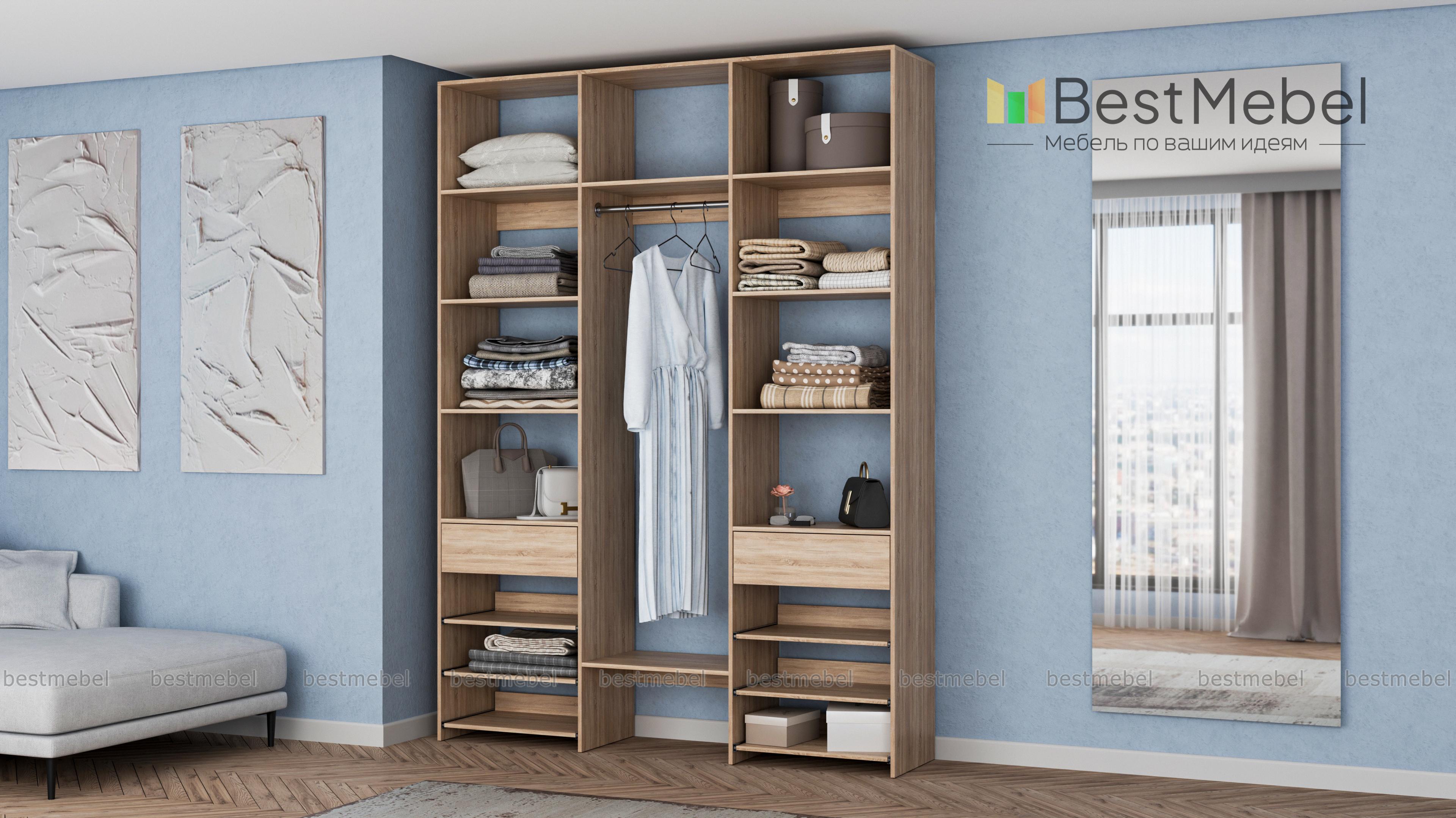 Стеллаж для одежды Мирта 93 BMS поможет вам разместить повседневные и редко используемые вещи. Удобная конфигурация включает в себя расположенные на разной высоте полки и секцию для вешалок, два ящика под мелкие предметы и выдвижные панели справа и слева. Благодаря изготовлению из ламинированной плиты стеллаж надежный, доступный по цене и обладает широким выбором актуальных оттенков. Купить стеллаж для одежды Мирта 93 BMS в оптимальном размере приглашаем к нам в интернет-магазин.