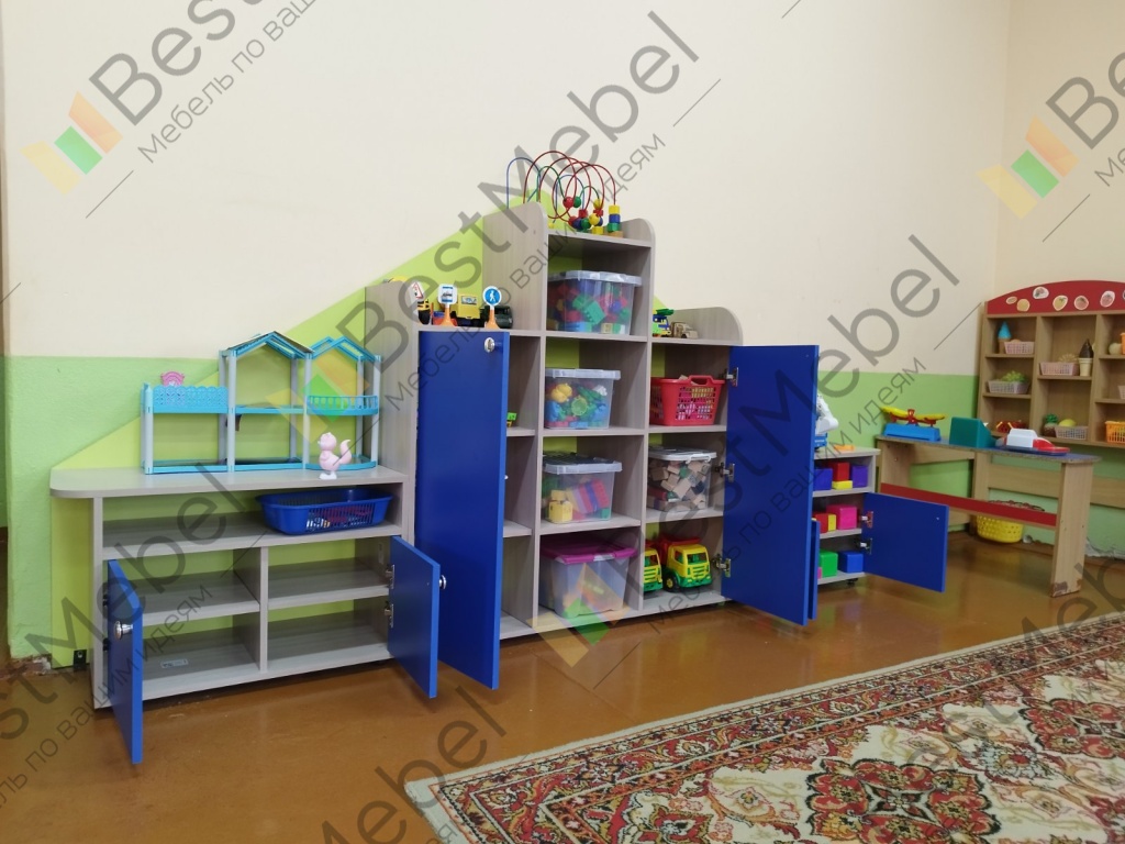 Стеллаж Долли 16 BMS с треугольной задней стенкой по форме напоминает домик и станет настоящим украшением игровой комнаты. Множество открытых полок и четыре глухих распашных шкафчика разместят на удобной для малышей высоте игрушки, книги и материалы для творчества. Красочный стеллаж выполнен из экологичных материалов и безопасно скруглен по углам, поверхности просты в уходе и надолго сохранят эстетичный вид. Купить стеллаж Долли 16 BMS вы сможете в нашем интернет-магазине, подобрав цветовое решение.
