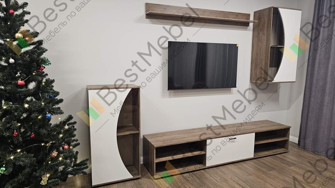 Поставил себе эту замечательную стенку в загородный дом. Целью было оформить телевизионную группу. Подобрал размеры больше стандартных, чтобы по ширине стены смотрелось гармонично.