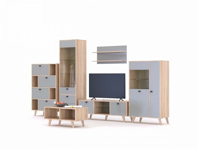 Стенка Вирджин BMS поможет оборудовать комфортную гостиную в едином скандинавском стиле. Отдельные модули комплекта легко комбинируются между собой, и вы легко подберете оптимальный вариант. Композиция включает в себя низкую тумбу под ТВ, две витрины, комбинированный стеллаж, навесную полку для книг и декоративных мелочей, а также удобный для сервировки журнальный столик. Светлые древесные тона корпуса эффектно сочетаются с фасадами платинового оттенка. Купить стенку Вирджин BMS приглашаем в наш интернет-магазин.