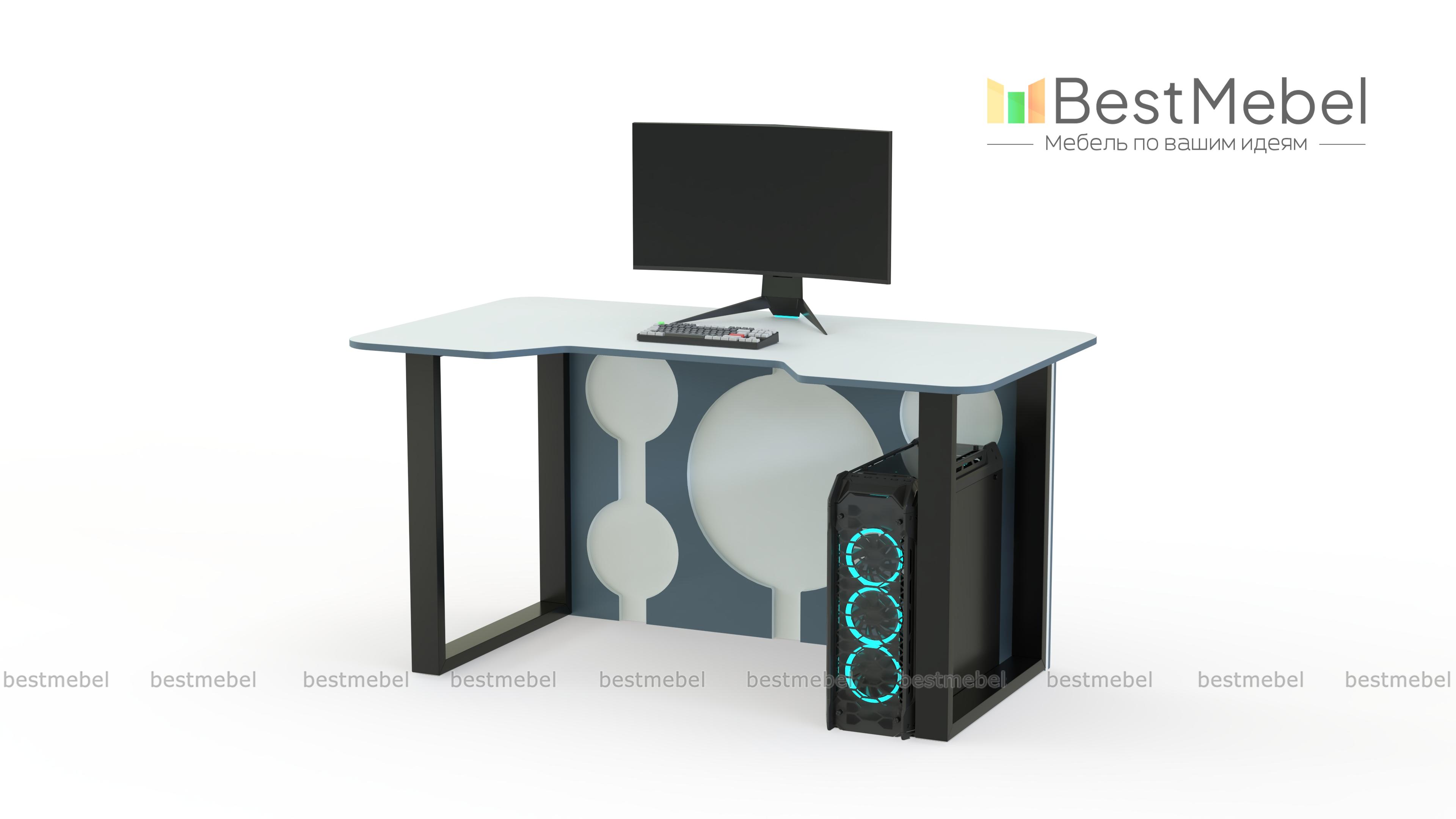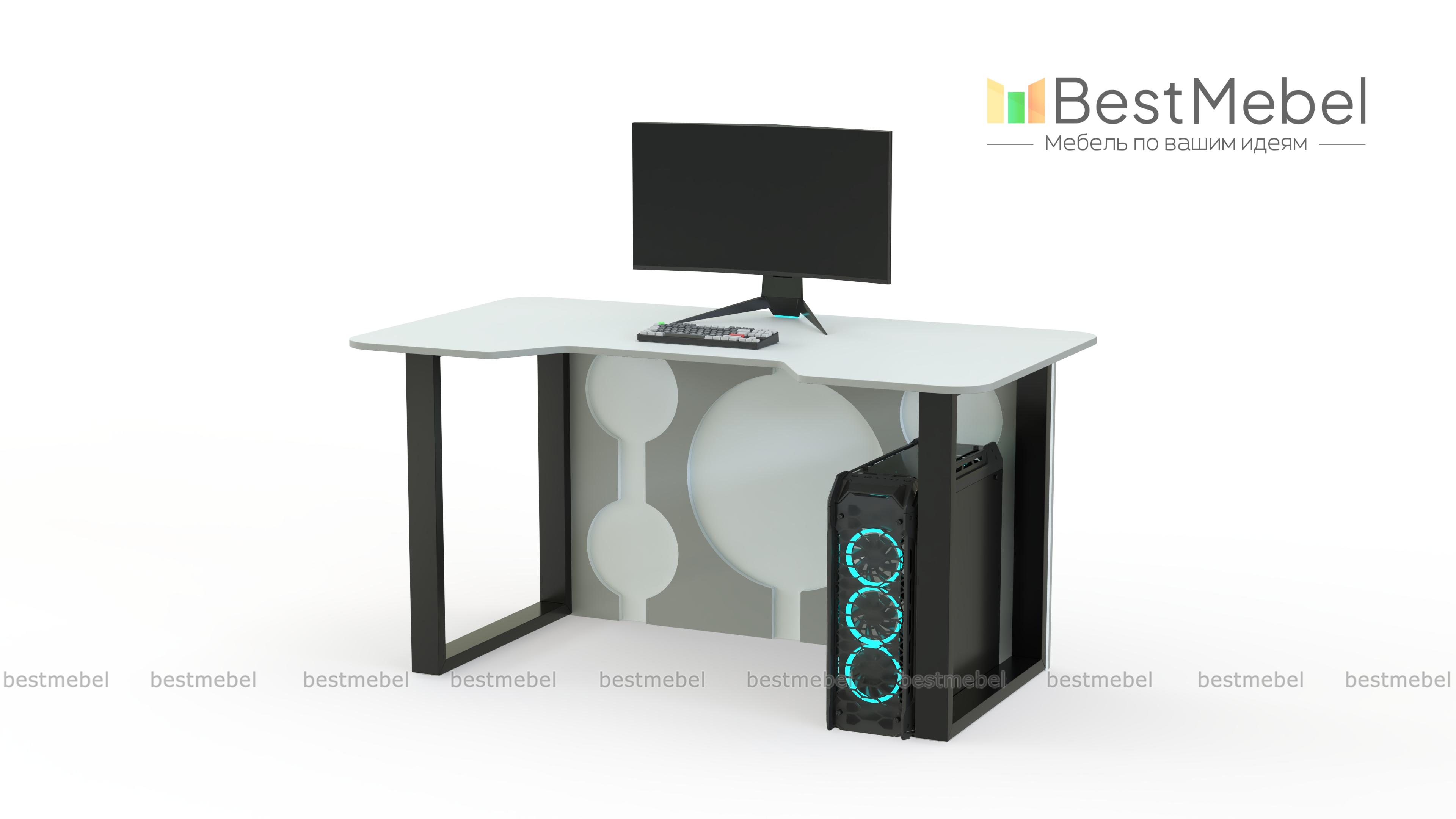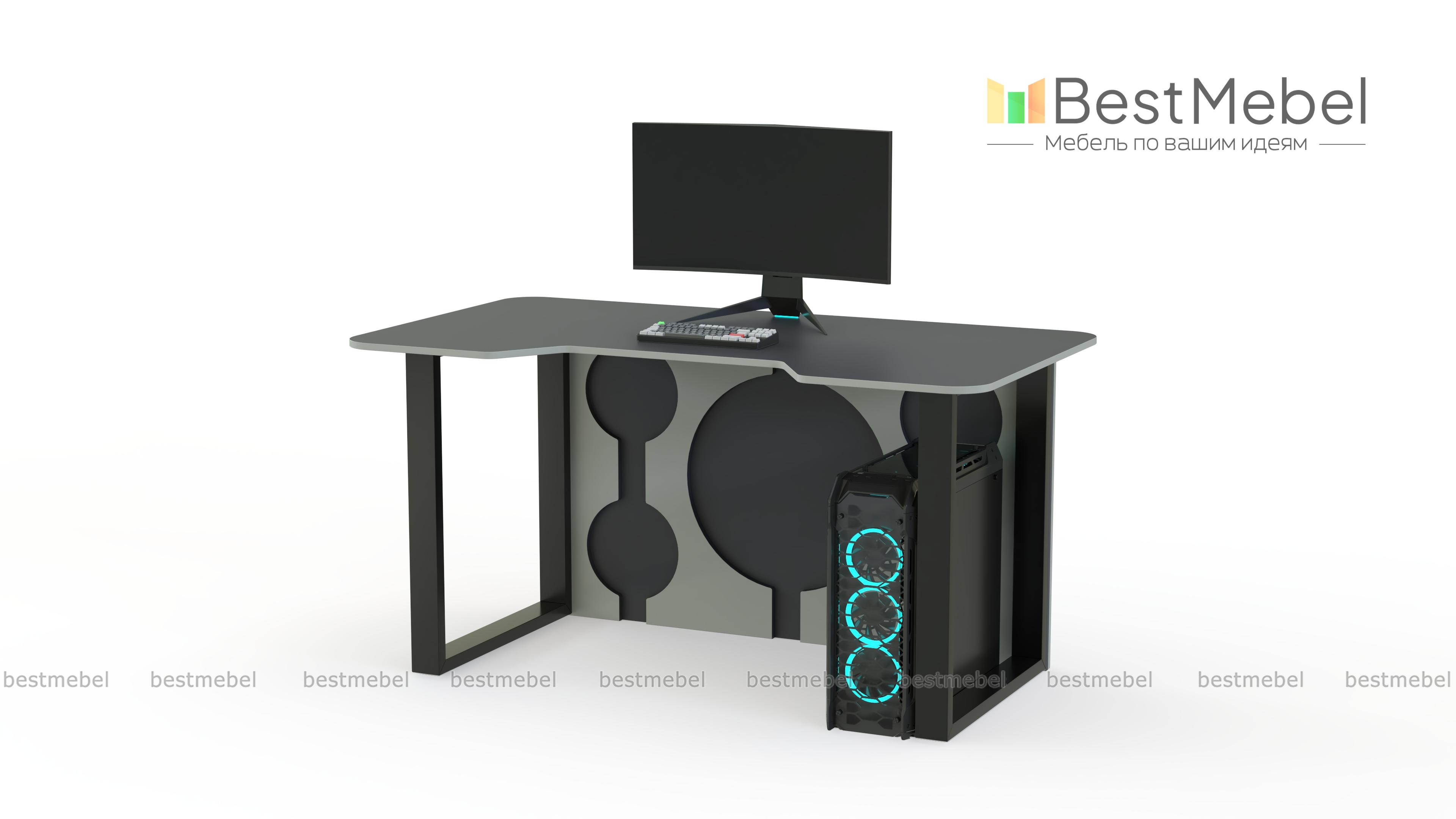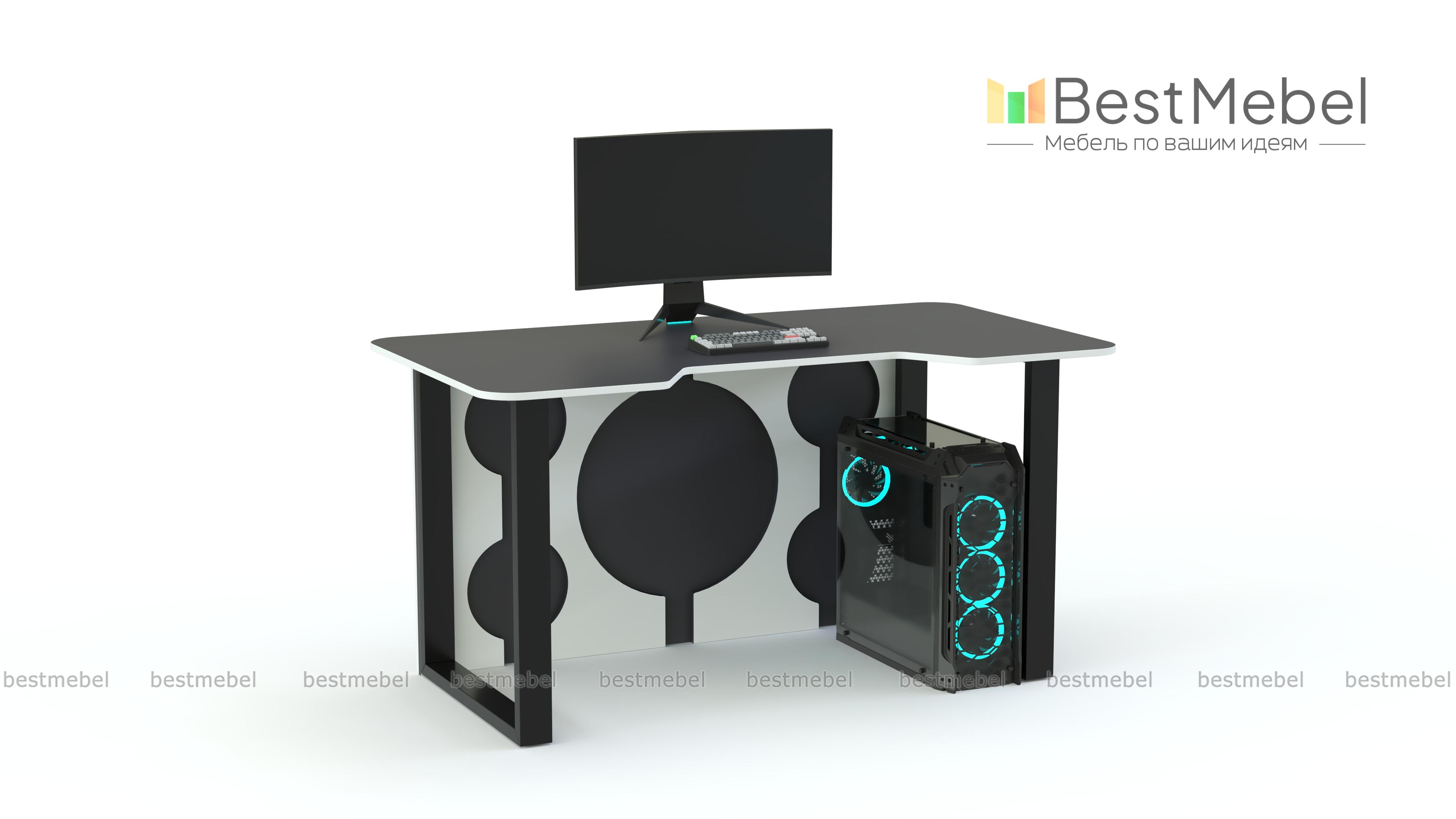 Геймерский стол Брук тип 8 BMS, выполненный в графитово-белой гамме, отличается ярким дизайном и эффектно дополнит интерьер в стиле хай-тек или индастриал. Модель располагается на устойчивых рамочных опорах и оборудована задней стенкой с декоративными круглыми вырезами. Просторная столешница безопасно скруглена по углам и имеет эргономичный вырез в передней части. Купить геймерский стол Брук тип 8 BMS для игры, учебы или работы вы сможете в нашем интернет-магазине.
