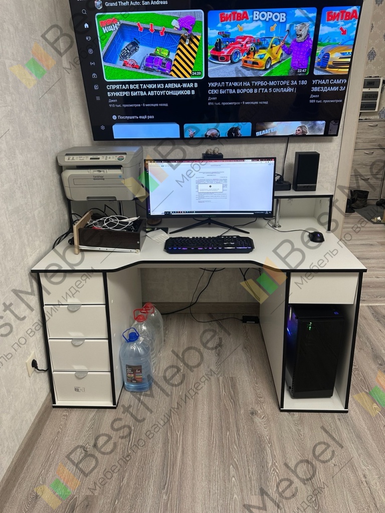 Оформил компьютерный стол №00000936277 Геймерский стол Шторм 11 BMS (1500х950х900). Привезли через неделю, доставили без проблем. Качество соответствует описанию. По комплектации вопросов нет. Хорошая мебель, можно смело советовать к приобретению, еще планирую заказать шкаф в прихожую. И самое главное еще хотелось отметить, что собирать ее очень удобно, так как на каждом элементе есть наклейки с цифрами, и по схеме тоже написаны цифры, сборка очень проходит легко.
