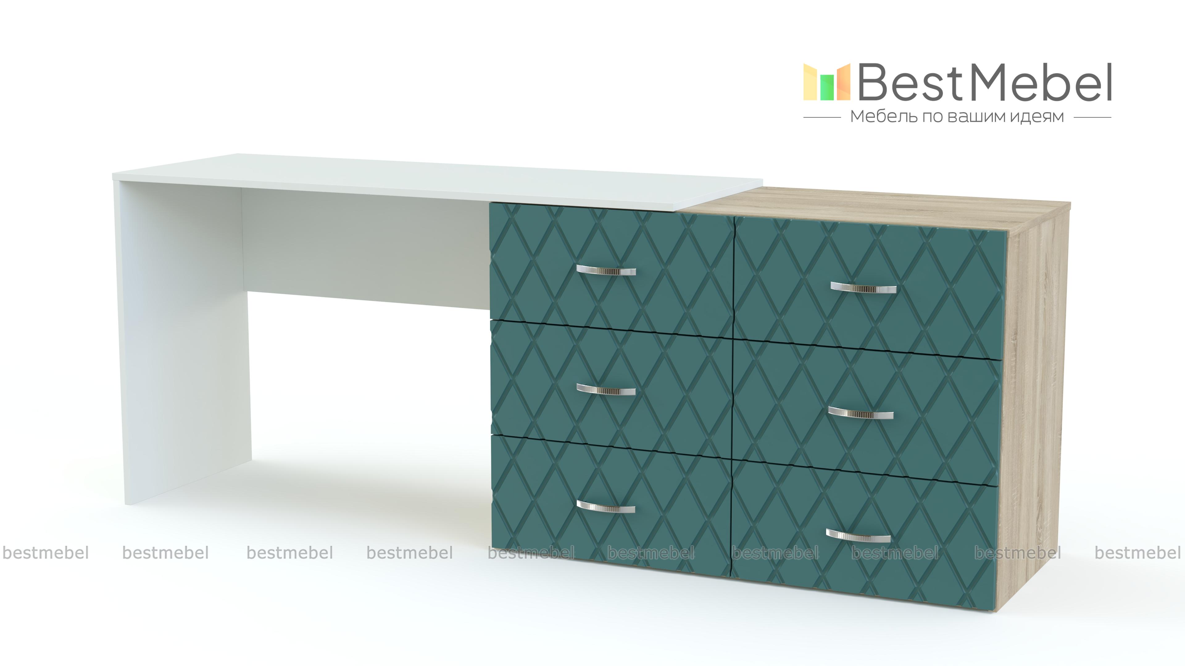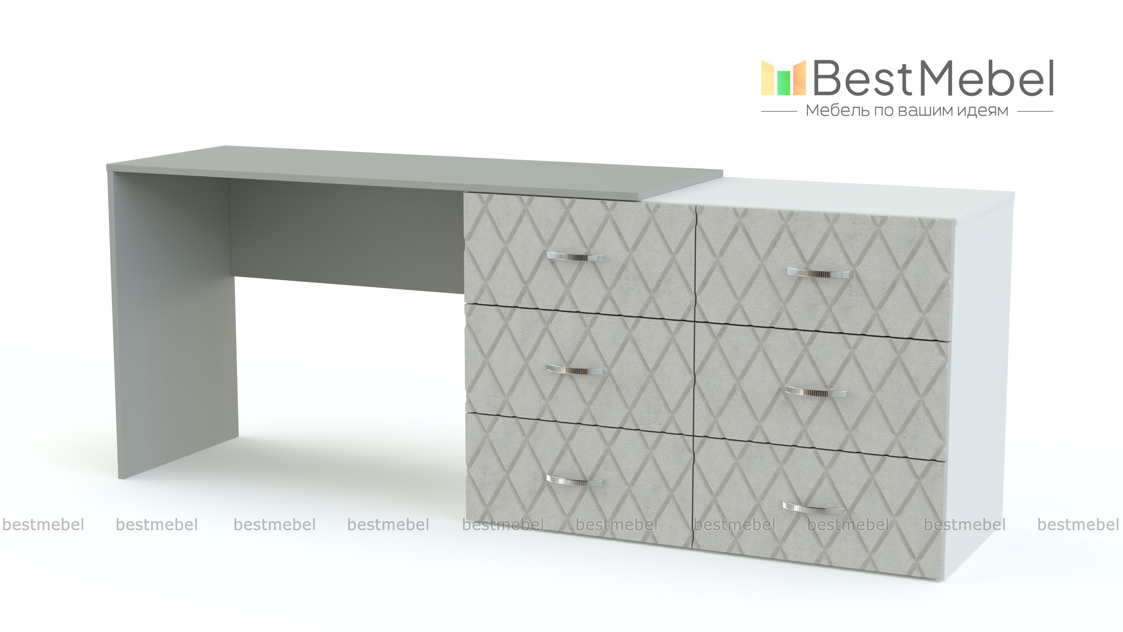 Туалетный столик Сая BMS сочетает в себе современный дизайн и функциональность. Модель, объединившая комод с шестью выдвижными ящиками и просторную столешницу, не только разместит большое количество вещей, но и может использоваться для работы, творчества или ухода за собой. Строгие линии композиции подчеркивает сочетание нейтрального темно-серого и контрастной белой столешницы, фасады комода декорированы фрезеровкой. Купить туалетный столик Сая BMS приглашаем в наш интернет-магазин.