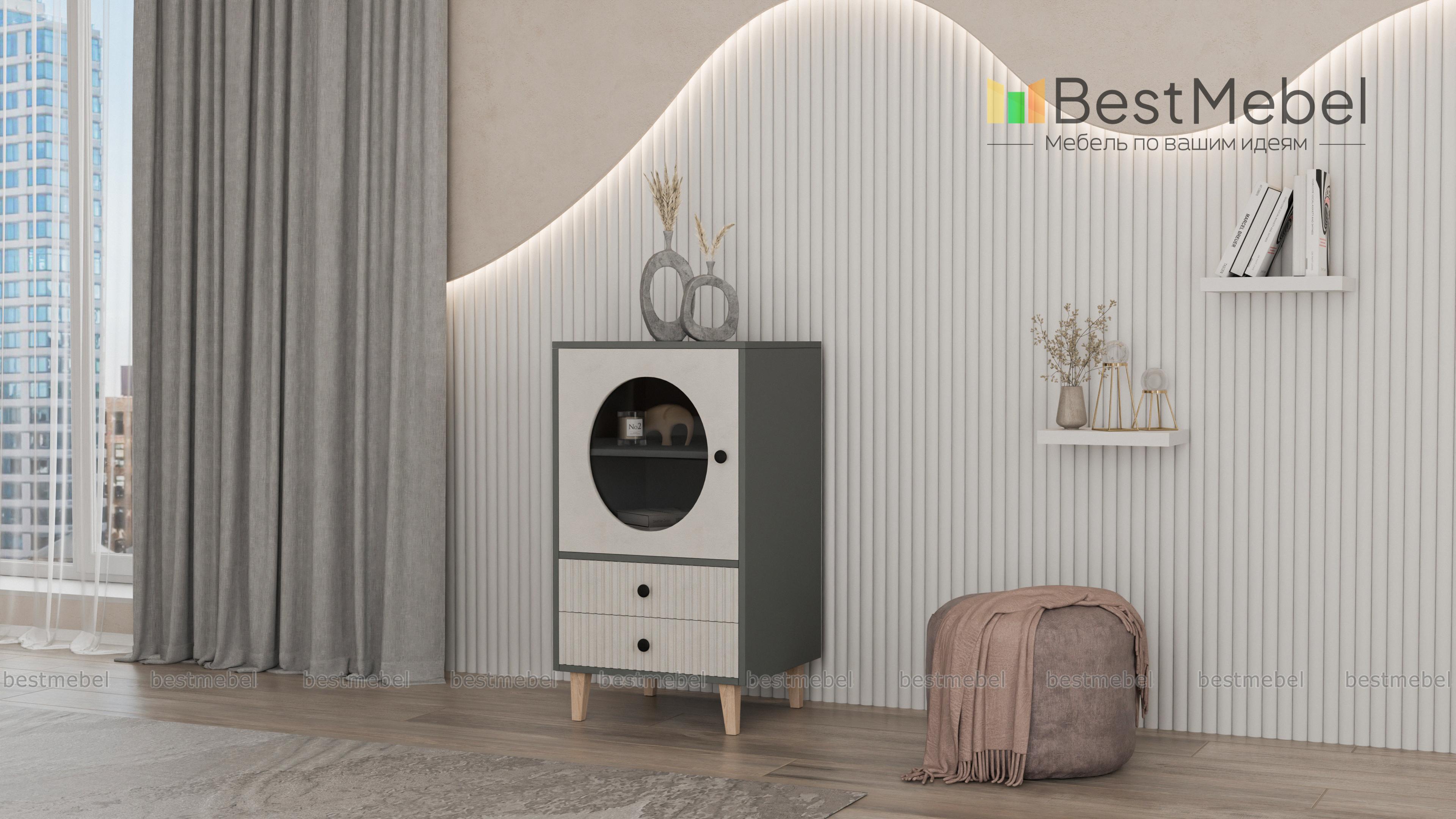 Тумба Брукс 1 BMS имеет компактные размеры и выразительный современный дизайн, привлекающий внимание. Для хранения и демонстрации ваших вещей прекрасно подходит витринное отделение с полкой и большим круглым вырезом, дополненное парой ящиков, украшенных фрезеровкой. Легкий силуэт тумбы создают высокие ножки древесного оттенка в тон корпусу. Купить тумбу Брукс 1 BMS с возможностью выбора цвета и габаритов приглашаем на сайт нашего интернет-магазина.