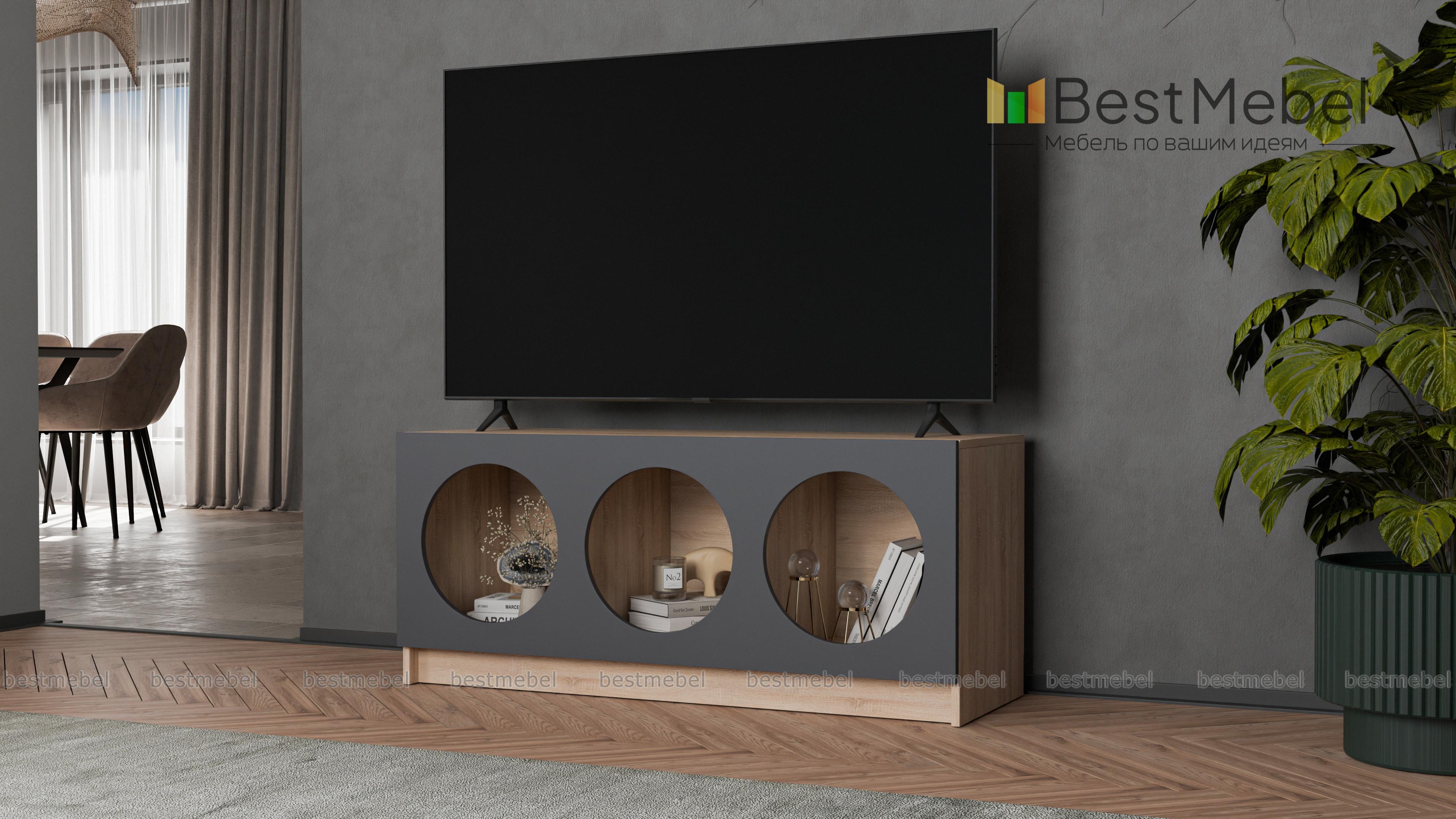 Тумба под ТВ Руди 5 BMS с цветным фасадом — компактный и стильный вариант в маленькую гостиную или комнату подростка. Вырезные круглые полки интересно представят книги, разнообразные гаджеты, интерьерные аксессуары и еще многое другое. Устойчивая конструкция с широкой столешницей оптимальна для размещения ТВ и прочей аудио- и видеоаппаратуры. Купить тумбу под ТВ Руди 5 BMS вы сможете в нашем интернет-магазине, подобрав гармонирующую с интерьером цветовую гамму.