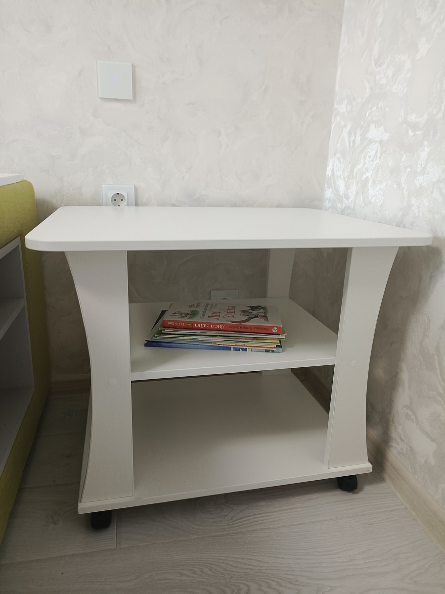 Заказ 00000889903Столик отлично подошёл в угол комнаты рядом с диваном. Покупали специально, чтоб ставить на него ёлку на праздник. Углы столика закруглены, так что ни ребенок ни взрослый не ударится об угол. На нижних полках можно складывать книжки, журналы, игры. Столик на колесиках, так что его может передвинуть даже ребенок, чтоб порисовать сидя перед телевизором. Очень удобно, что на сайте магазина можно выбрать цвет. Мы выбирали под цвет деталей дивана, который мы также заказывали на Бестмебель.