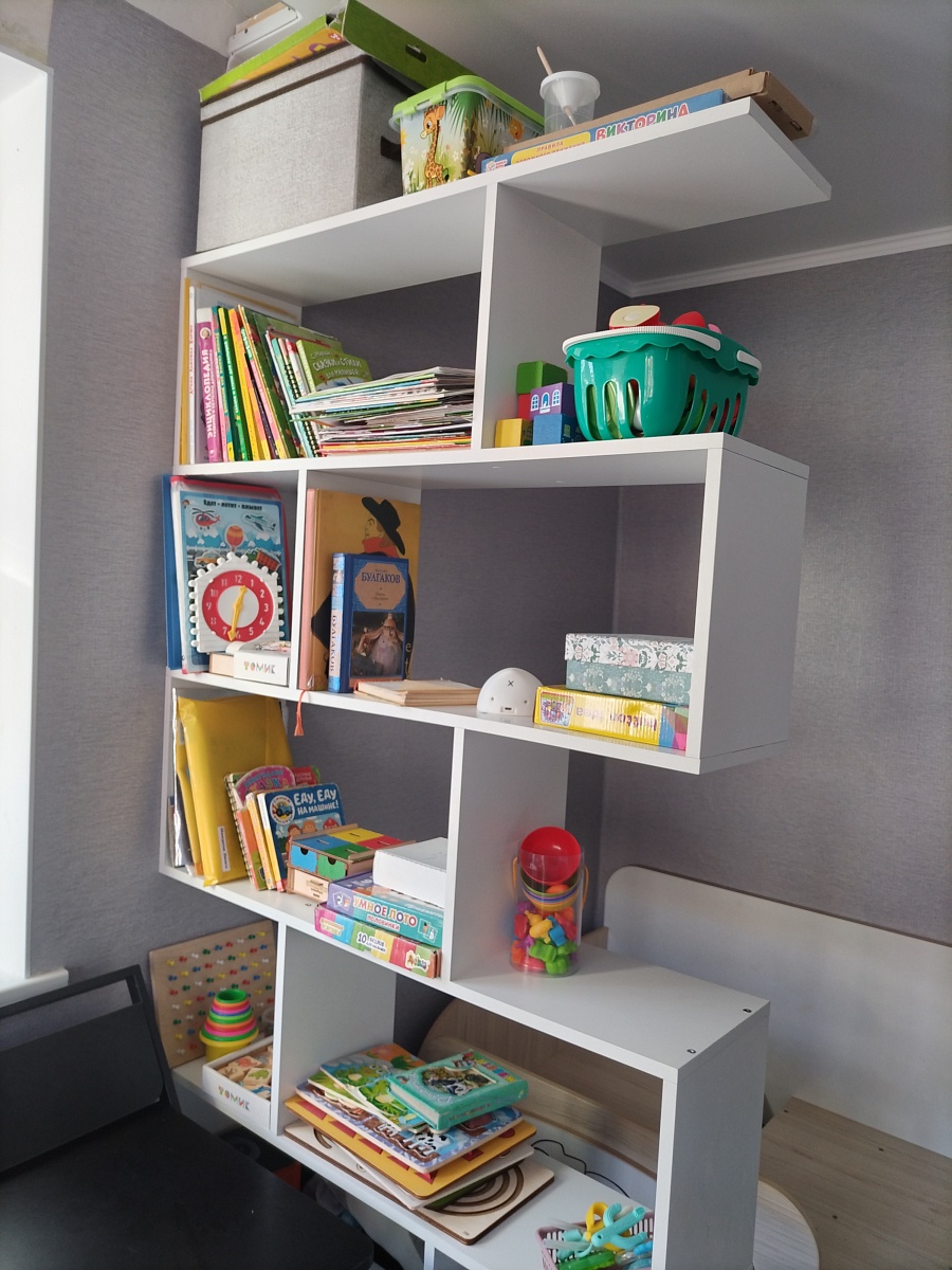 Стеллаж очень удобный, вместительный и стильный. Он не занимает много места в комнате, что особенно важно, если пространство ограничено. Мы выбрали его для своего ребёнка, так как нужно было разделить комнату на рабочую и спальную зоны, не загромождая её и не нарушая гармоничного вида.
