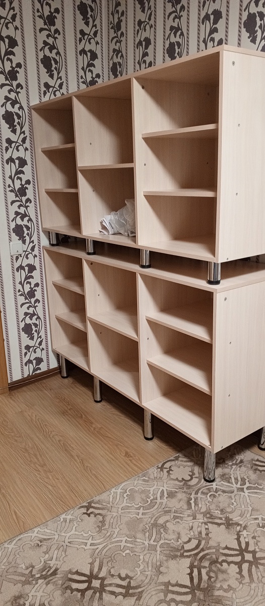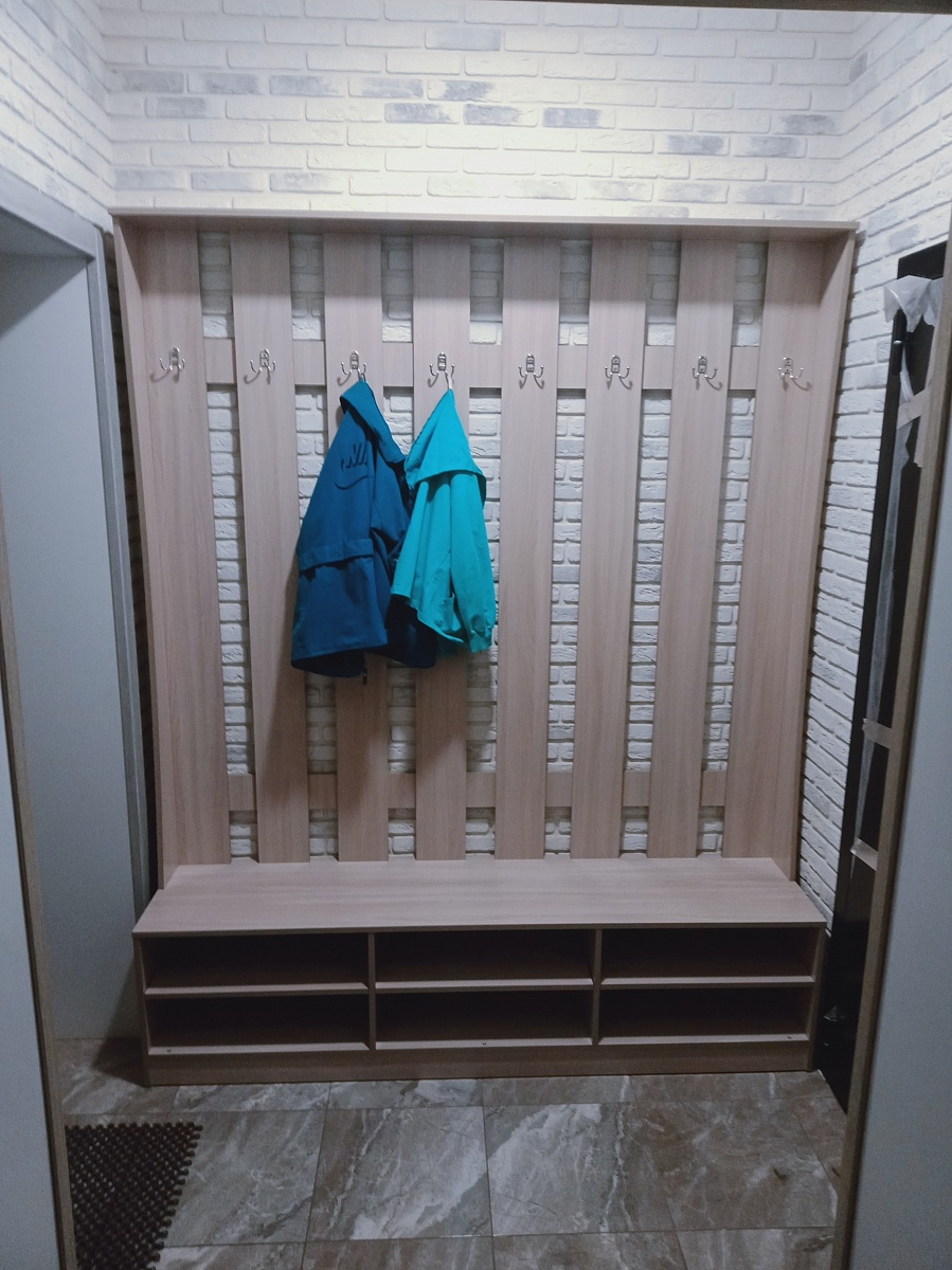 Заказ №10704. Прихожая шириной 1800мм, высотой 2200мм, имеет 8 двойных крючков для одежды и 6 отделений для обуви. Влезает примерно 18 пар обуви, съёмная полка добавляет трансформируемость прихожей - её можно при желании убрать и поставить высокие сапоги. Отлично вписалась в тесное пространство прихожей и позволила разгрузить от горы обуви вход в тамбур. - при монтаже надо быть аккуратным, так как могу образоваться нежелательные сколы на деталях.- из-за высоты, которая оказалось выше дверного проёма пришлось собирать отдельно верх и низ прихожей. Собирается легко - главное не спешить и внимательно изучить инструкцию. Детали подписаны это упрощает сборку.