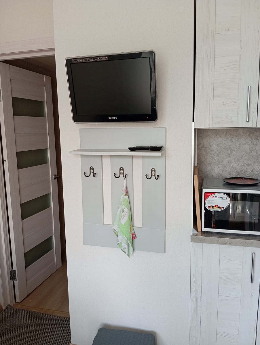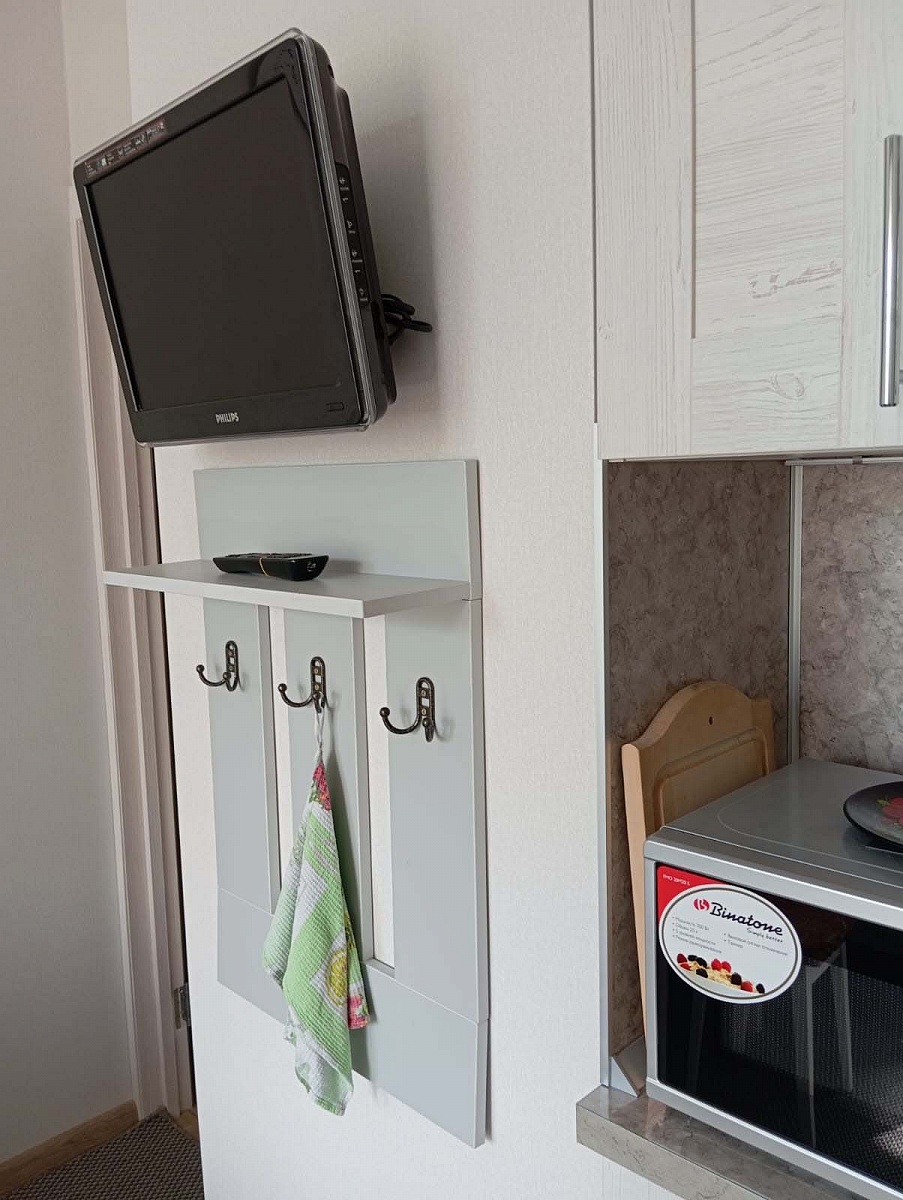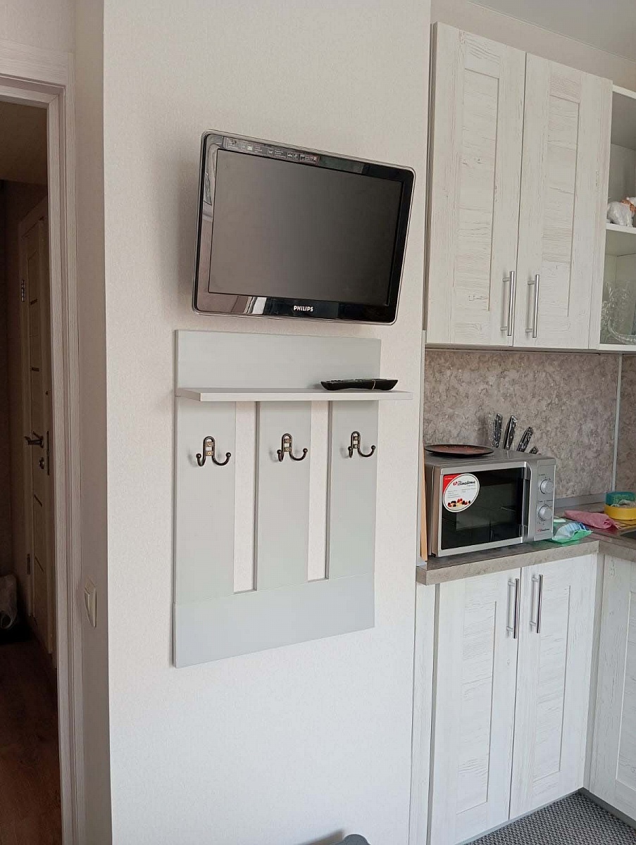 Заказ №891627 от 05.10.2023. Нужна была вешалка на кухню для полотенец и фартуков, чтобы они не касались стены. + полочка под тв для пульта. Отлично подошёл вариант вешалки Олимп. Указала нужные размеры. Цвет серый. Единственный нюанс  – немного загнулась от стены нижняя часть общей панели. И крючки бы сделала повыше – ближе к полке. 00000522970   Вешалка Олимп 2 BMS (500х700х150)
