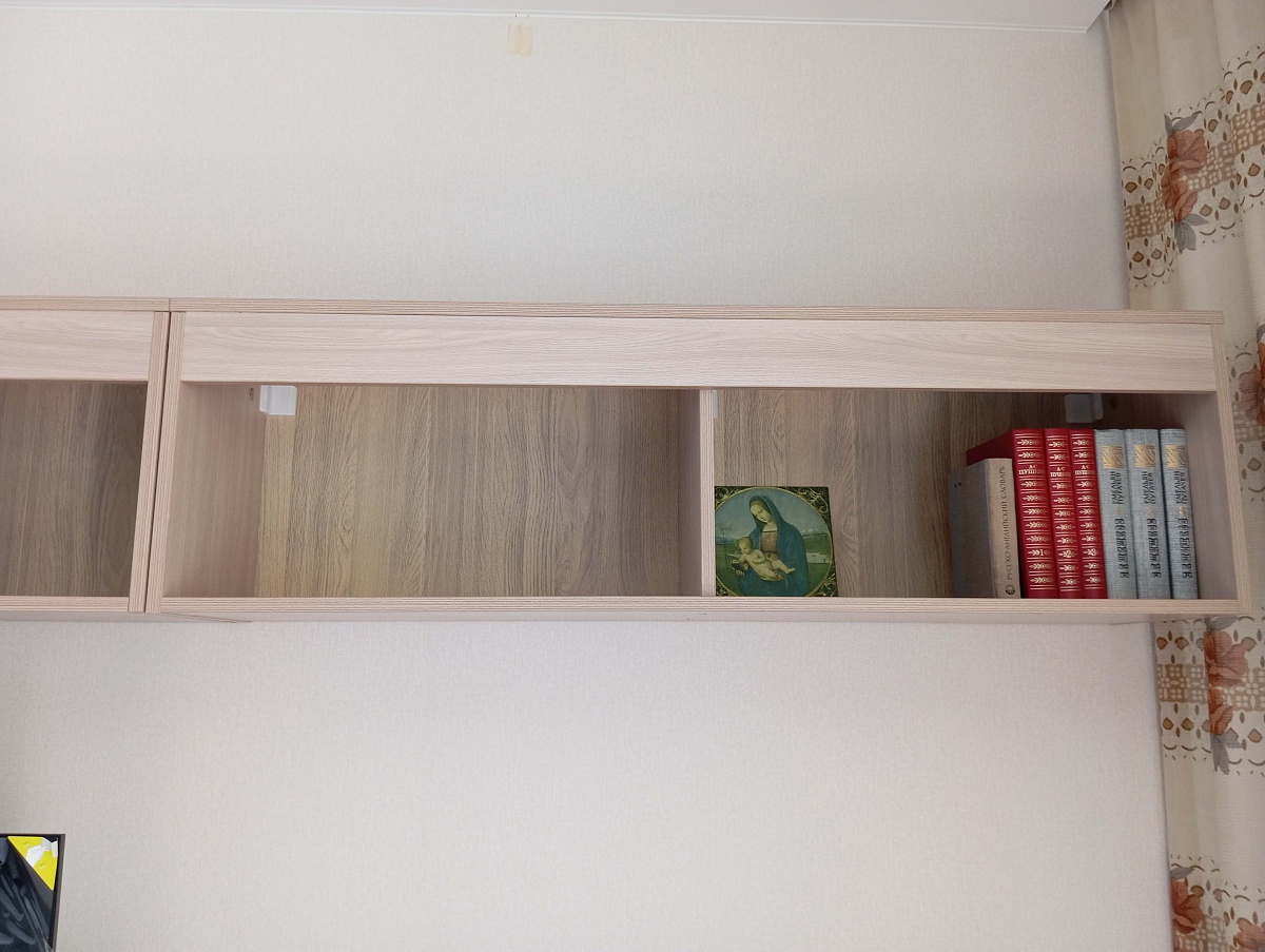 Заказ №891627 от 05.10.2023. Заказала две полки вряд - над столом и комодом. Замечательный сборщик установил на нужную высоту. Полки удобные, крепкие. Цвет Ясень Шимо Светлый в комплект с другой мебелью. Покупкой довольна, рекомендую. 00000522963  Полка Жако 5 BMS (1200х350х300)