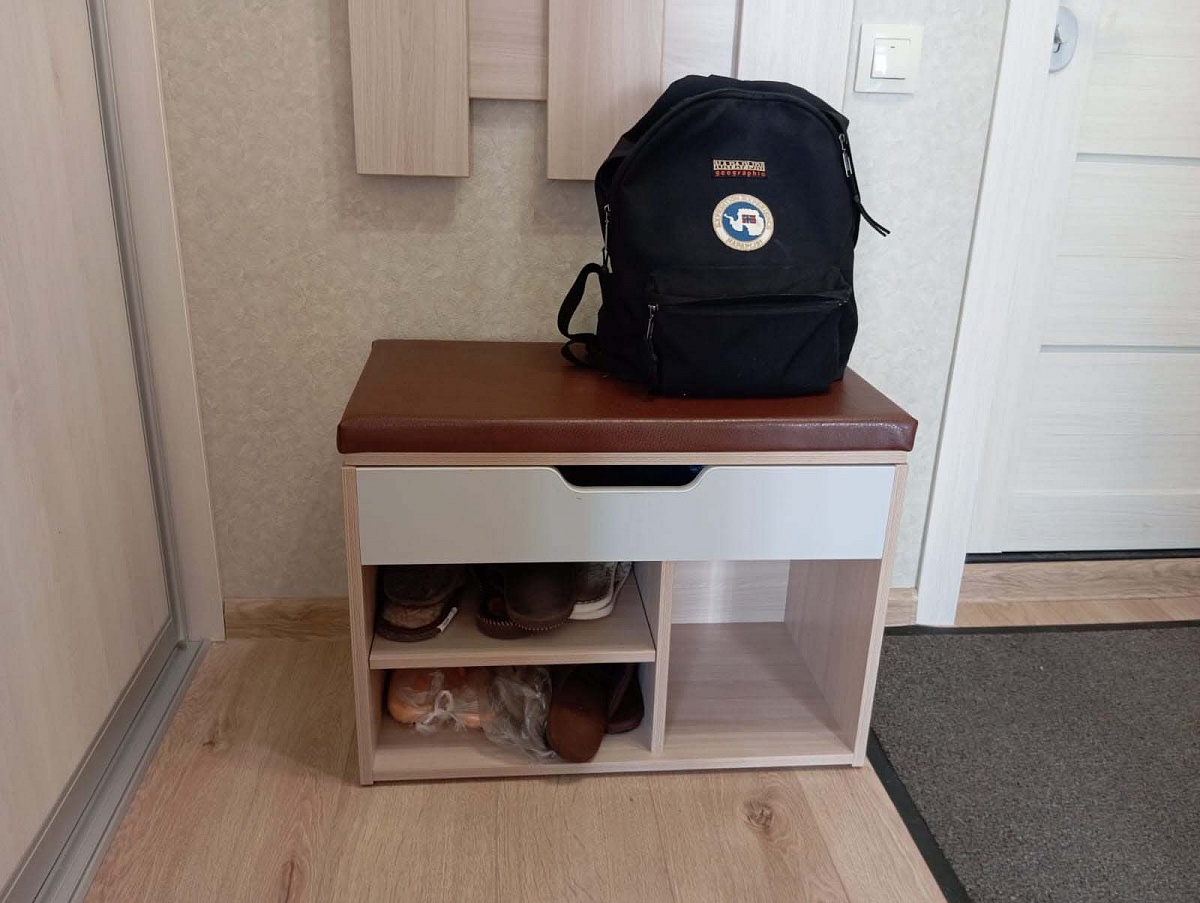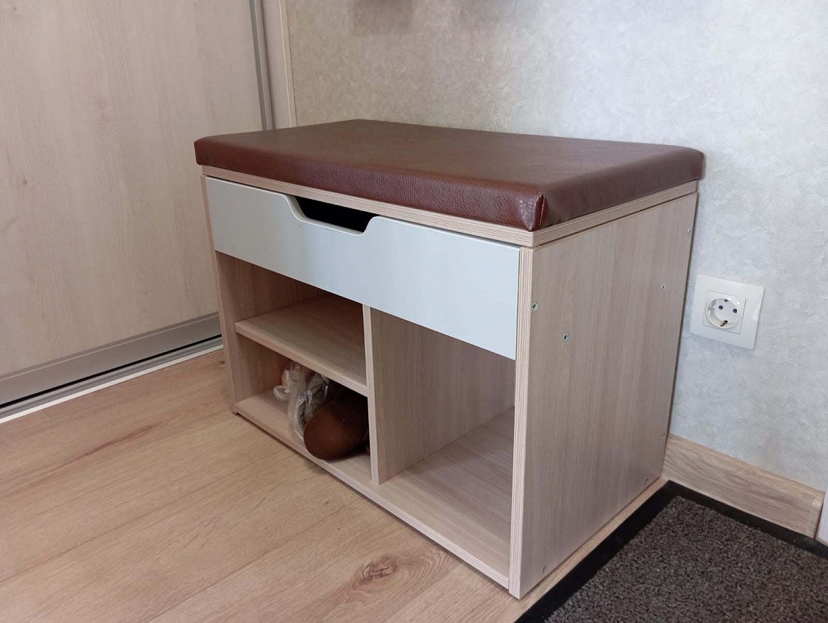 Заказ №891627 от 05.10.2023. Обувницу заказала небольшую, с нужными мне размерами в маленькую прихожую. Несмотря на компактность обувница многофункциональная. Есть и полки для обуви разной высоты, и сидение, и закрытый ящик для мелочей. Цвет Ясень Шимо Светлый/ фасад Серый/ сидение Коричневый. Покупкой довольна, рекомендую. 00000522965   Обувница Томас 1 BMS (650х500х350)