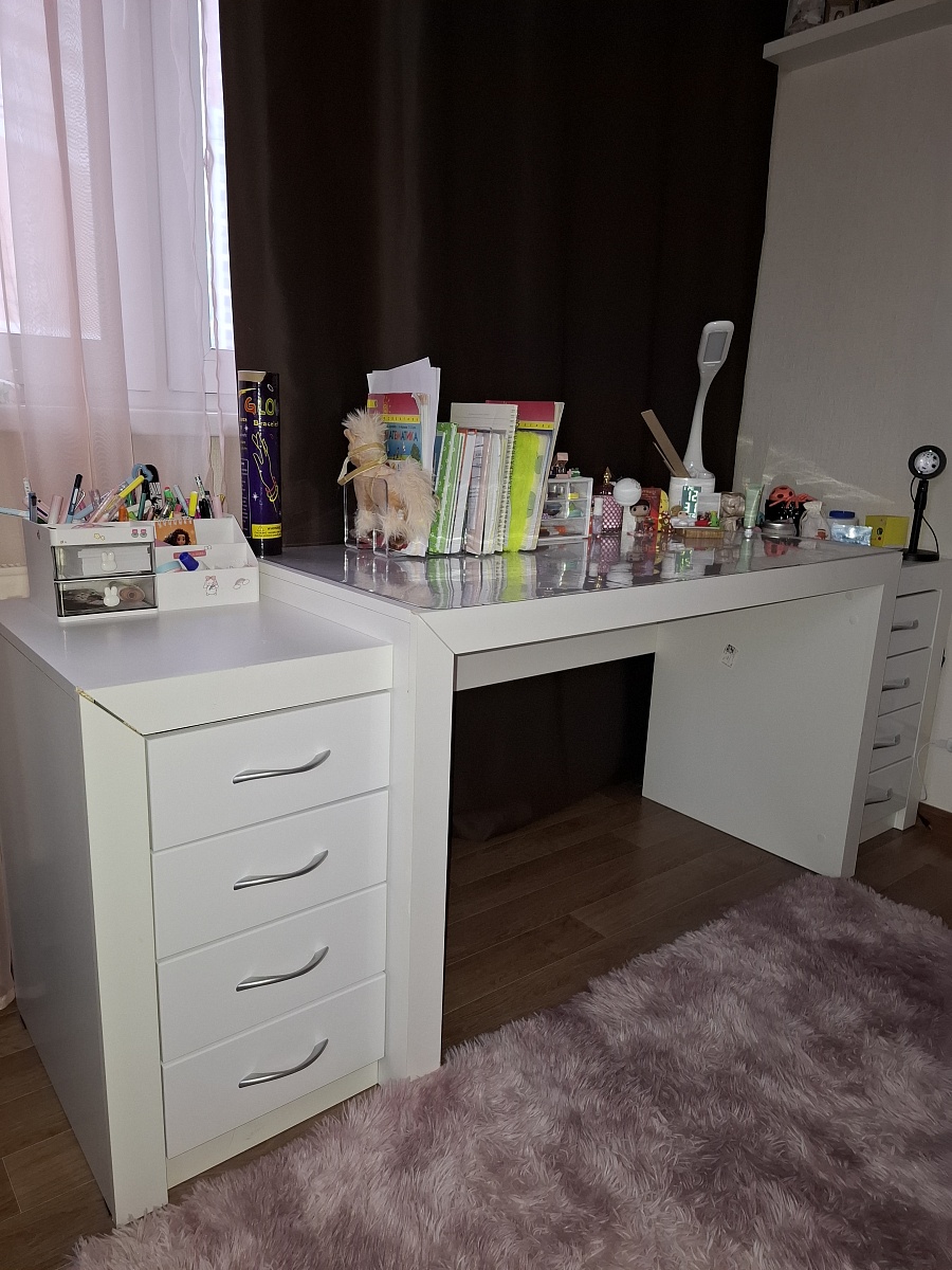 Заказ 00000252127, Угловой письменный стол для двоих Канзас 34 BMSЗаказывали этот стол для детской комнаты. Искали именно угловую модель, чтобы у каждого ребёнка было свое рабочее место. По ширине стол идеально вписался в размеры комнаты.Плюсы:Длина столешницы более 1,7 метра . Это очень удобно. Дети не мешают друг другу, свободно размещают учебники, канцелярию, у каждого теперь своя полка и по два отдельных ящика. Конфликтов из-за места теперь нет + в комнате стало легко поддерживать порядок.Качество сборки и материалы. Стол приехал в надежной упаковке, все детали были целы. Собирали по инструкции, процесс стандартный. Фасад тумб и столешница выглядят аккуратно, заявленного цвета «венге/дуб сонома».Угловая форма позволяет каждому сидеть в удобном положении.Отличное соотношение цены и качества.Недостаток: качество кромки на столешнице. Этот недостаток легко устраняется покупкой кромки на маркетплейсе за копейки. Запах ДСП держится какое-то время, но со временем проходит.Итог: Стол «Канзас-34» — нам идеально подошёл. Комфортно, уютно, удобно и со вкусом. Рекомендую.