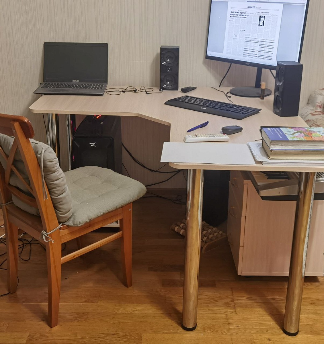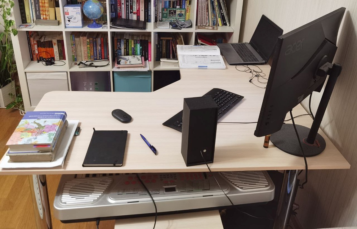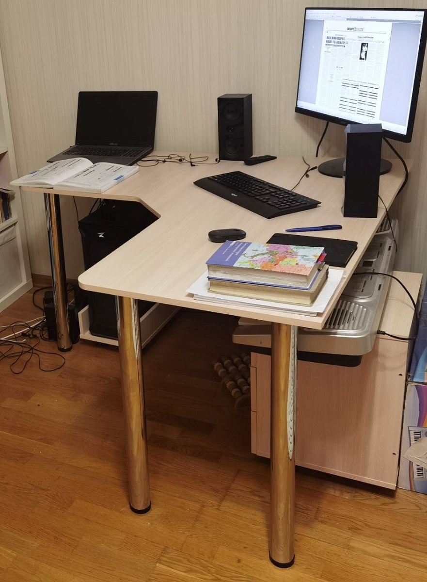 Долго примеривался к этому столу, все-таки купил - и не прогадал. Идеальный по размерам - помещается все, что вздумается на него положить. Хорошо организует пространство - можно повернуть и в ту, и в эту сторону; угол не делает его угловатым и не загромождает окружающий мир. Легкий, воздушный, и в то же время прочный, уверенно стоит на ногах. Тумба на колесах, подставка под комп тоже полноприводная, очень удобные в обращении. Рекомендую.