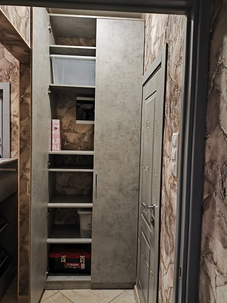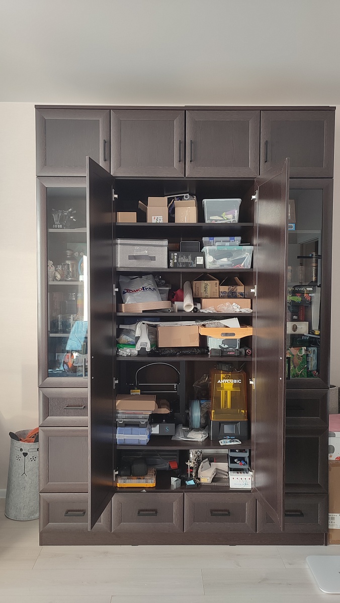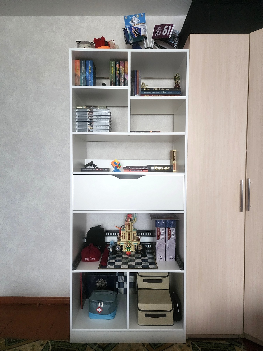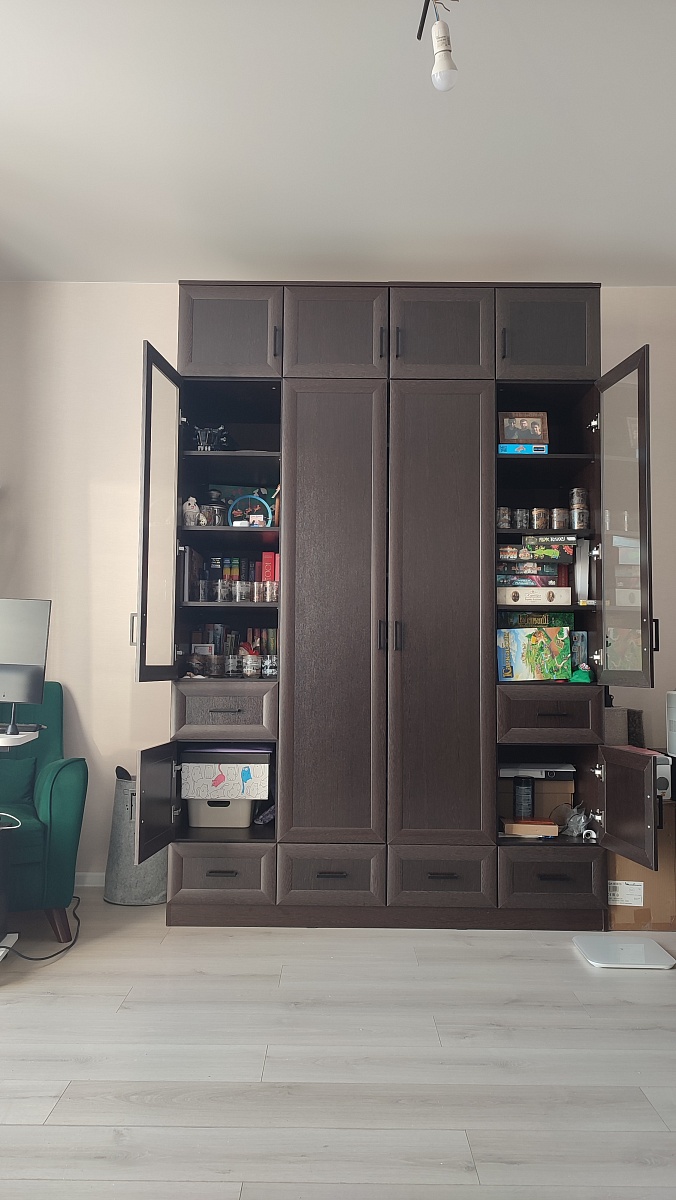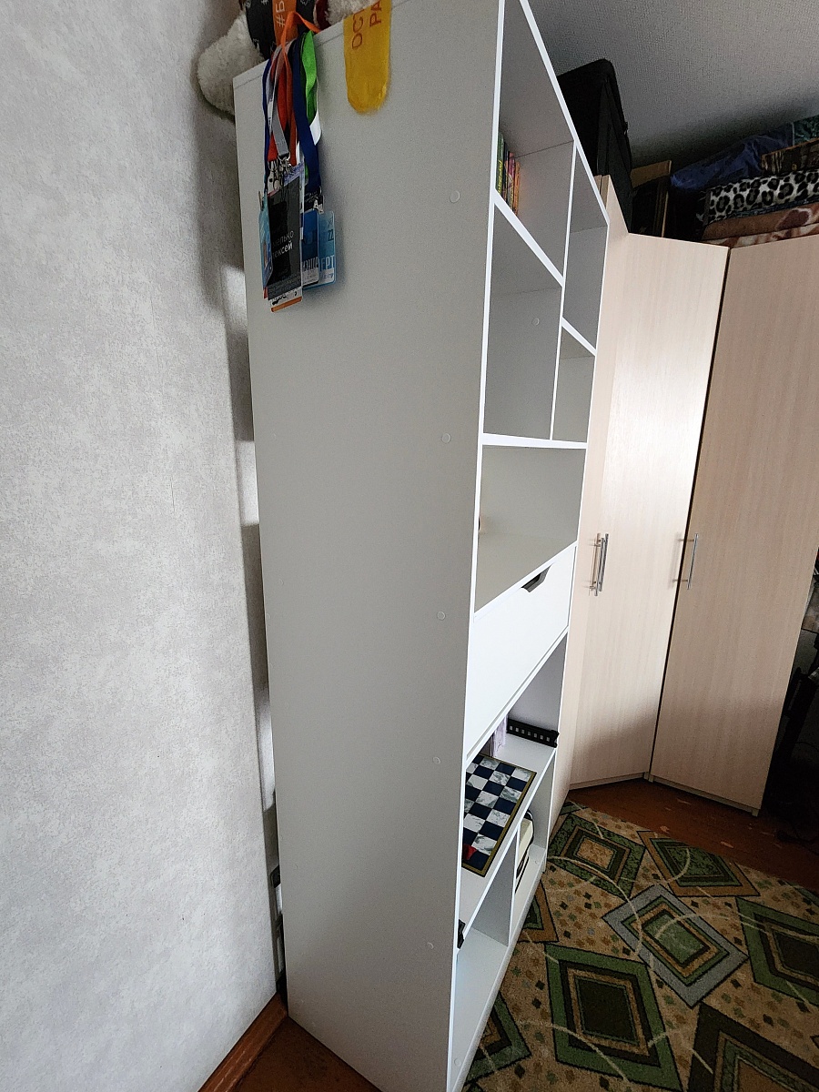 Именно этот дизайн стеллажа подошёл по моим надобностям. И что я получил в итоге?Перво-наперво, сборка была не такая простая и понятная. Инструкция в комплекте непонятная от слова совсем, благо был QR-код на 3D модель. Т.е. после сборок мебели от Ikea очень сильно отличается инструкция.Зазоры. В некоторых местах заметны небольшие просветы, даже после того как многие получилось подтянуть.И последнее плохое, то-ли при доставке, или изначально: на стойке есть след дефекта как-будто провели чем-то острым, но след неглубокий (которую расположил плохой стороной к шкафу). Это мелочи, но не приятно.К хорошему Удобства конструктора на сайте. Ты можешь буквально всё изменить, а потом ещё и запросить объёмный вариант, чтобы представлять что получится в итоге. Добавить другие направляющие, подсветку и т.п.Поддержка на уровне, на всех этапах помогала решить все нюансы.В общем и целом, рекомендую, если готовые варианты у других производителей не устраивают!