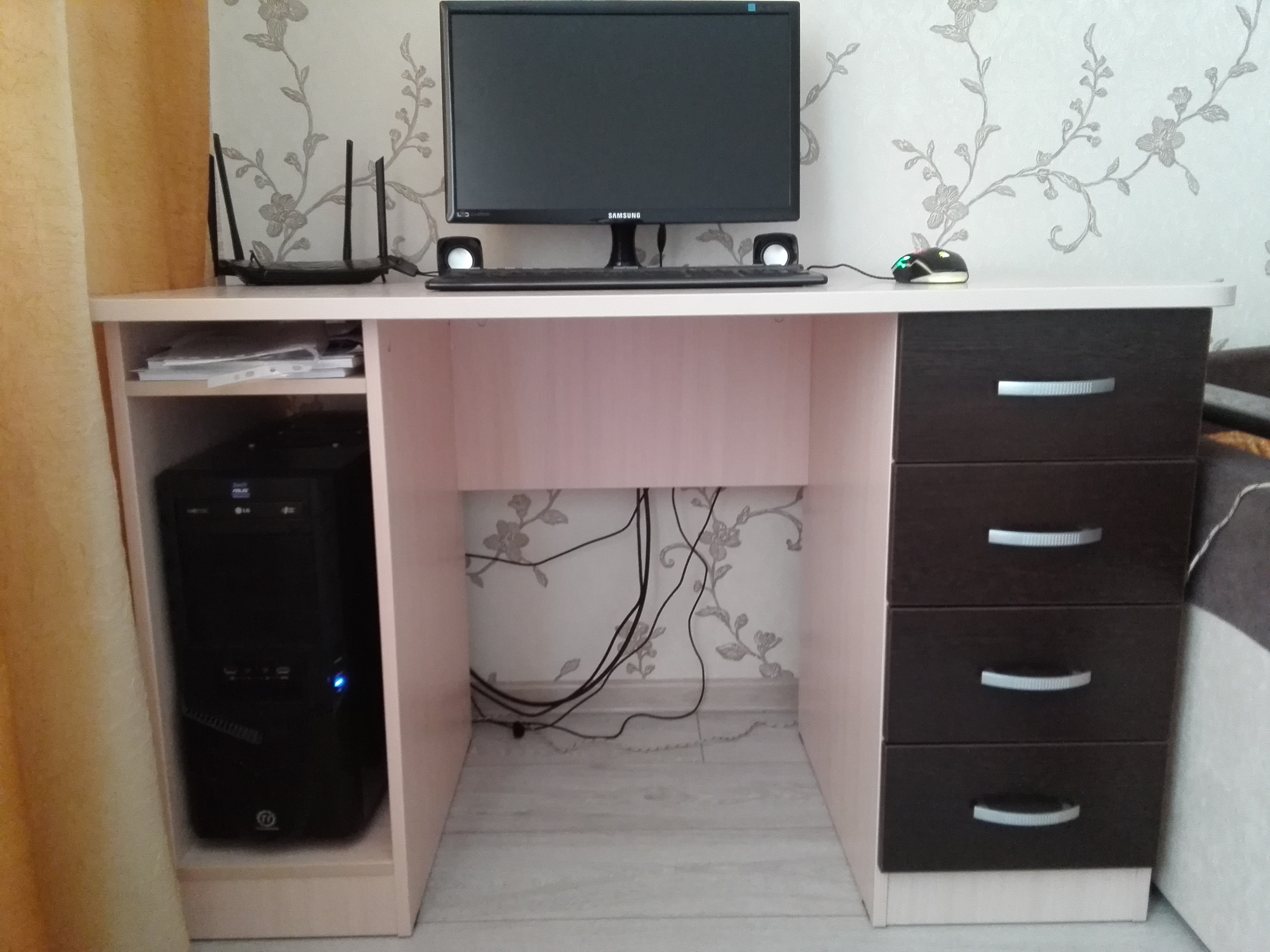 Очень долго подбирала стол, т.к. это главное для меня рабочее место, тем более надо было все продумать, поскольку у меня маленькая квартира-студия. По эргономичности все отлично, достаточно полочек и ящичков, где можно хранить все документы, даже принтер хорошо вписался. Минус только что системный блок немного выпирает, хоть я и мерила все по сто раз... и столешница если бы была поглубже было бы удобнее, но это скорее уже мои личные пожелания, в целом отличный стол. Особенно порадовала возможность выбора цвета, и так уж совпало, чисто случайно, цвета подбирала на глаз, чтобы хоть немного сочеталось с кухней что стоит рядом, в итоге, как видно на фото, цвет один в одни) Хотя производители разные и даже названия этих цветов разное.
